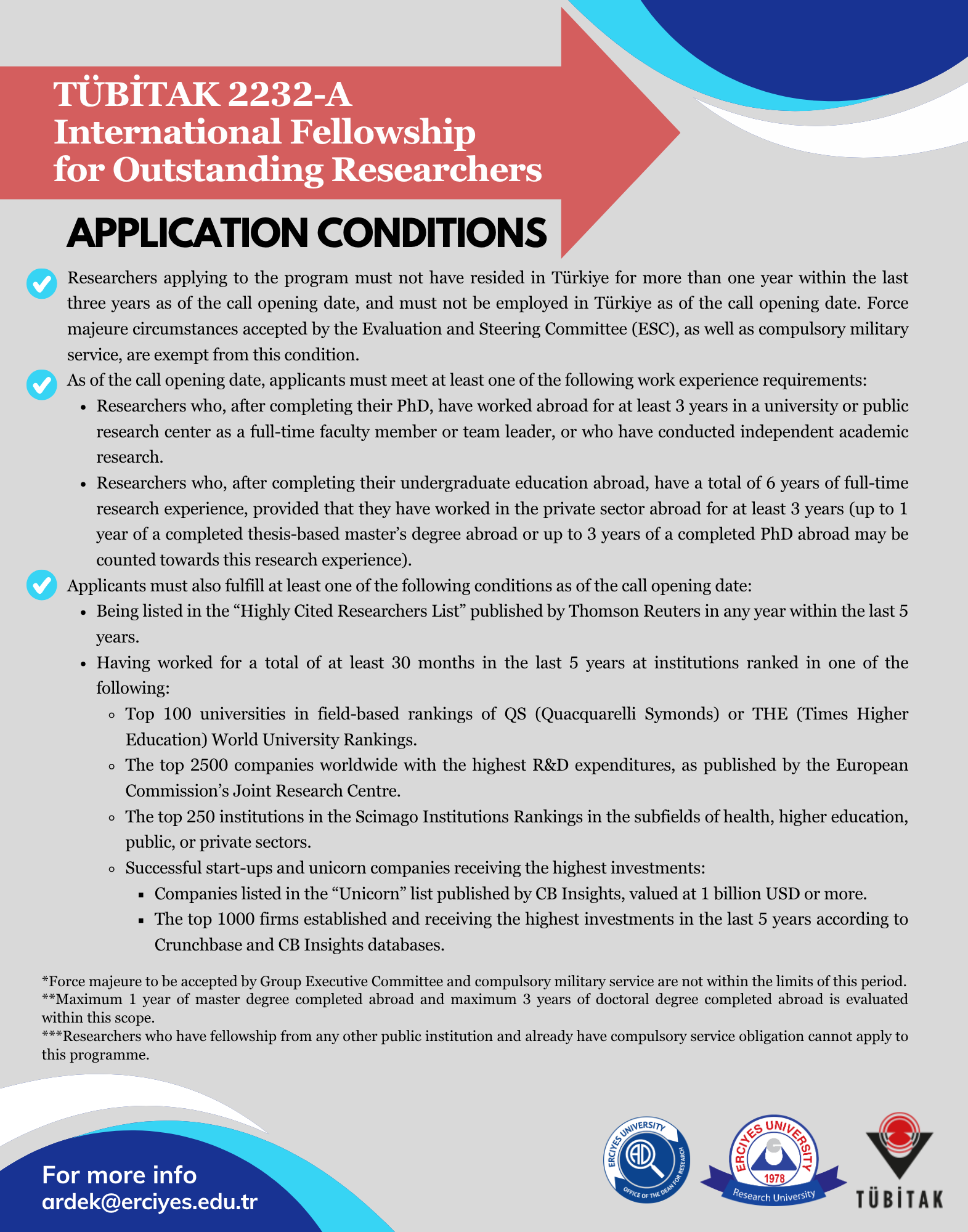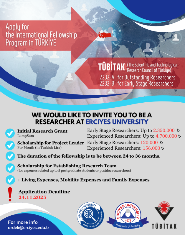 We would like to invite you to be a researcher at Erciyes University. The Scientific and Technological Research Council of Türkiye (TÜBİTAK) aims to support qualified researchers with leading scientific and/or technological achievements and international work experience to conduct research in leading universities, industry or public organisations to contribute in areas of strategic value for Türkiye. To achieve this goal, the International Fellowship for Outstanding Researchers Programme (2232-A), and the International Fellowship for Early Stage Researchers Programme (2232-B) are open for applications until 24 November 2025. Erciyes University invites international researchers to conduct research with the confidence of being a research university.
