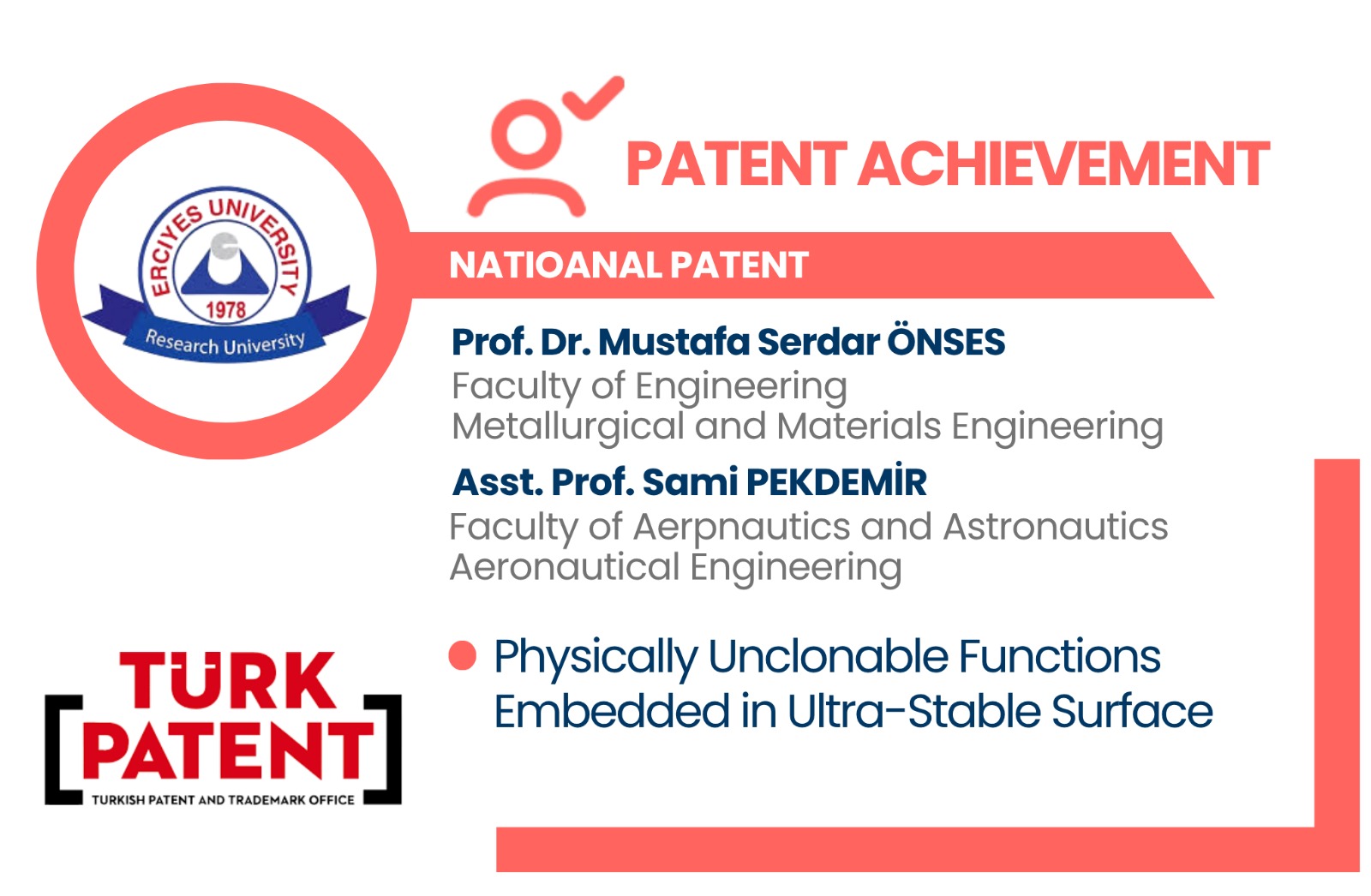 Developed by Prof. Dr. Mustafa Serdar ÖNSES from the Department of Metallurgy and Materials Engineering/ERU Faculty of Engineering and Asst. Prof. Sami PEKDEMİR from the Department of Aeronautical Engineering/ERU Faculty of Aerpnautics and Astronautics, and Dr. Abidin EŞİDİR, a PhD graduate from the Metallurgy and Materials Engineering Program/Erciyes University, the project titled "Physically Unclonable Functions Embedded in Ultra-Stable Surface" has been granted a national patent.