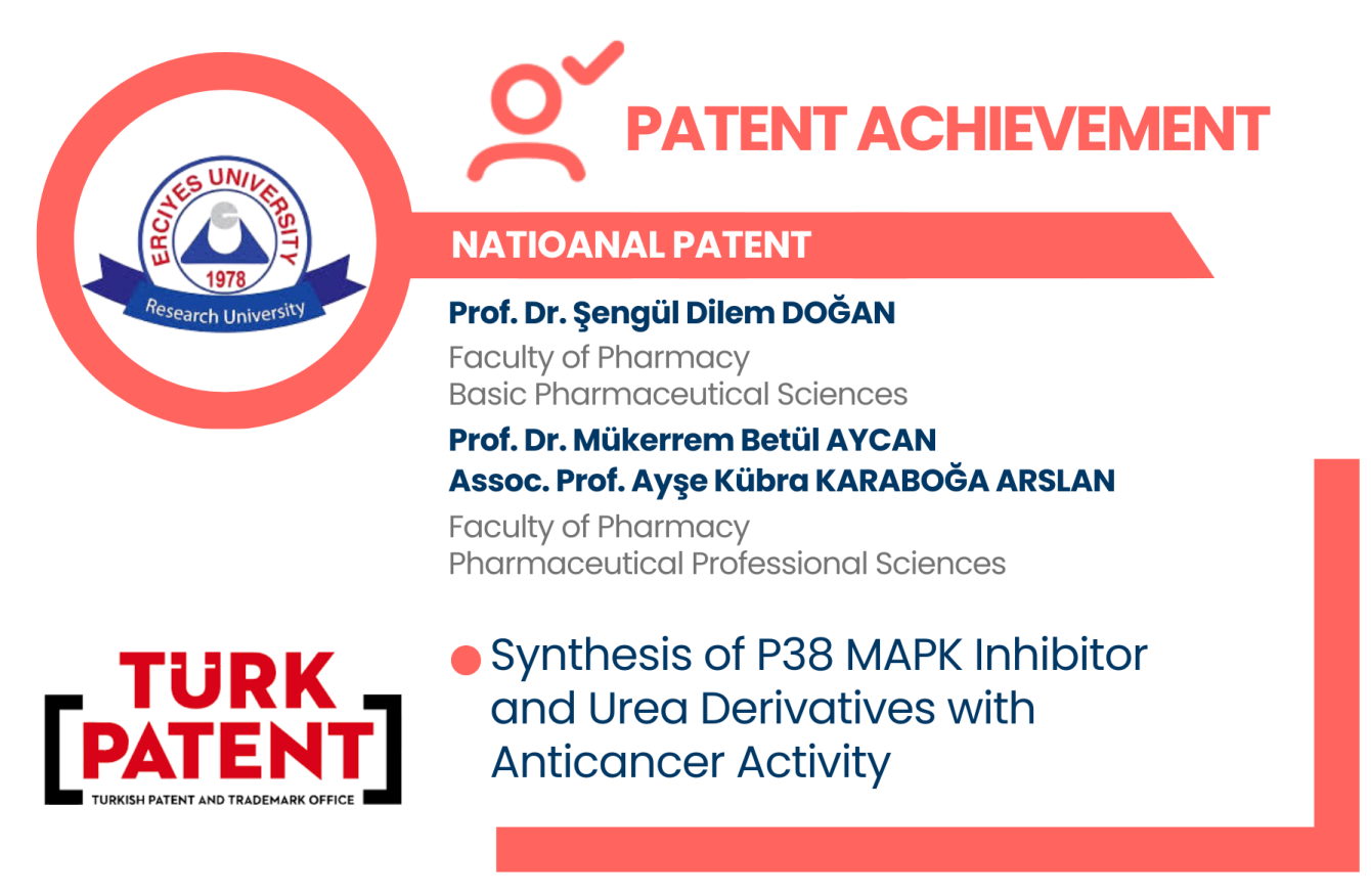 Developed by our university's Faculty of Pharmacy, Basic Pharmaceutical Sciences faculty member Prof. Dr. Şengül Dilem DOĞAN, Faculty of Pharmacy Pharmaceutical Professional Sciences faculty members Prof. Dr. Mükerrem Betül AYCAN and Assoc. Prof. Ayşe Kübra KARABOĞA ARSLAN, and one of our university graduates Pharmacist Rüveyde KELEŞ, the national patent titled "Synthesis of P38 MAPK Inhibitor and Urea Derivatives with Anticancer Activity," has been registered by the Turkish Patent and Trademark Office.