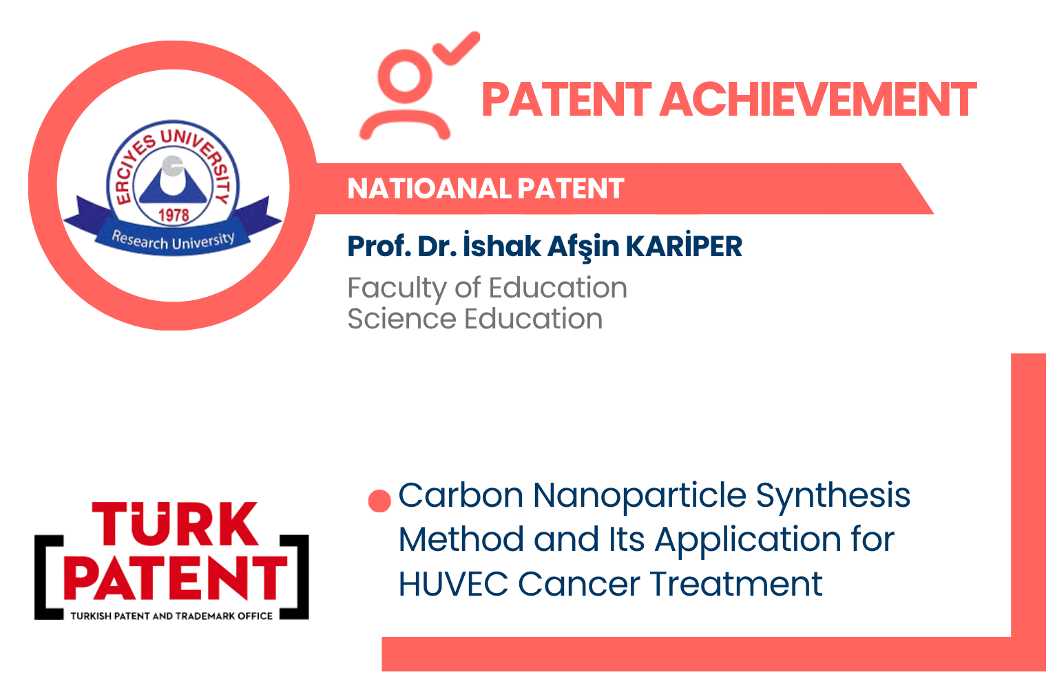 International Patent titled "Carbon Nanoparticle Synthesis Method and Its Application for HUVEC Cancer Treatment," developed by Prof. Dr. İshak Afşin KARİPER from the ERU Department of Science Education of the Faculty of Education, has been registered by the Turkish Patent and Trademark Office.