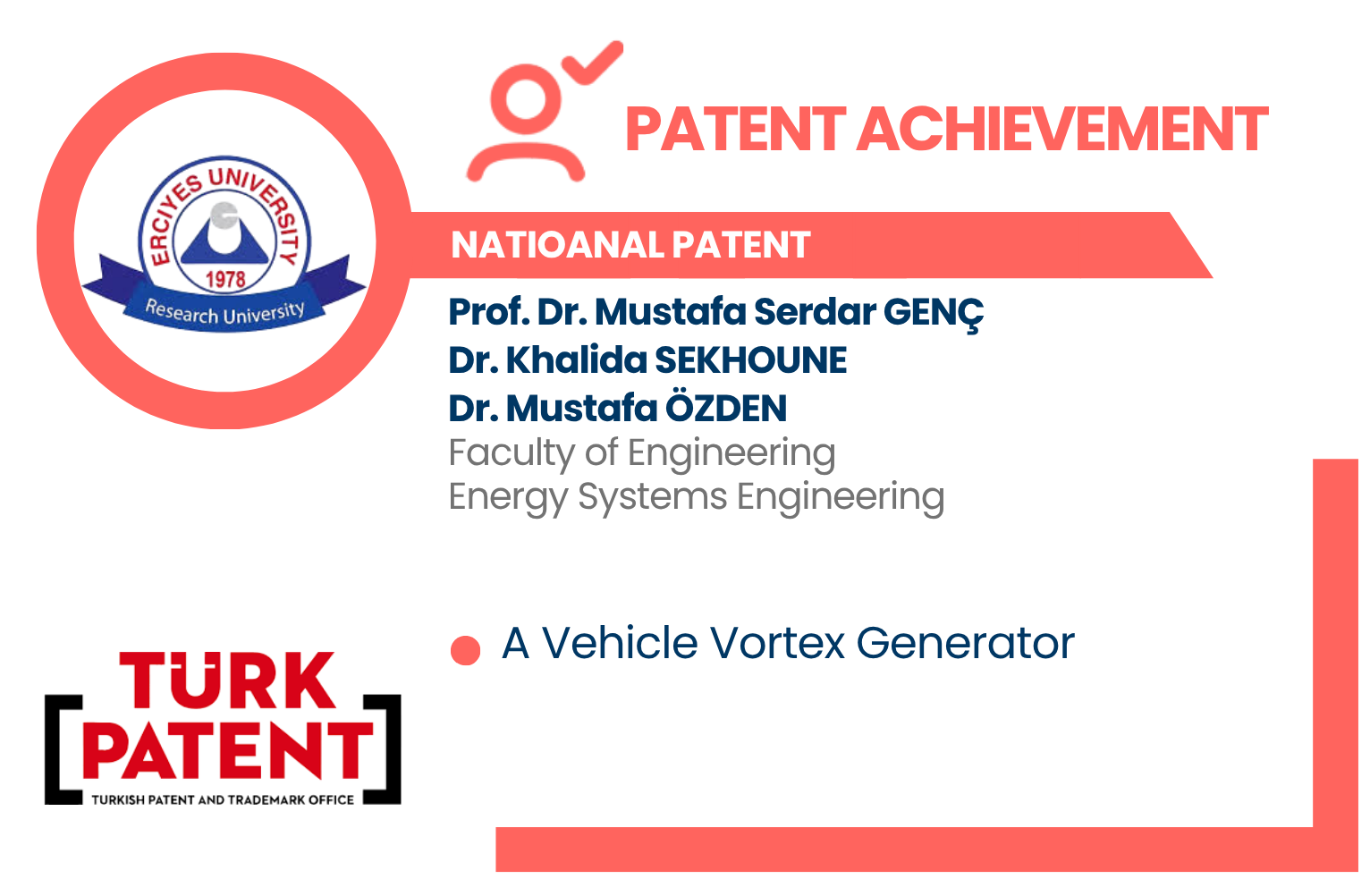 National Patent titled "A Vehicle Vortex Generator," developed by Prof. Dr. Mustafa Serdar GENÇ from the ERU Department of Energy Systems Engineering of the Faculty of Engineering, post-doc researchers Dr. Khalida SEKHOUNE, and Dr. Mustafa ÖZDEN, has been registered by the Turkish Patent and Trademark Office.