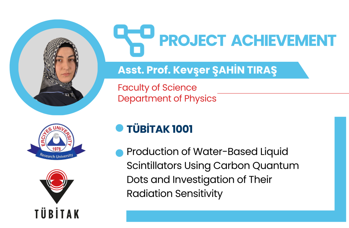 The project titled “Production of Water-Based Liquid Scintillators Using Carbon Quantum Dots and Investigation of Their Radiation Sensitivity,” led by Asst. Prof. Kevser ŞAHİN TIRAŞ from the ERU Department of Physics of the Faculty of Science, has been awarded funding by TÜBİTAK under the TUBİTAK 1001- Scientific and Technological Research Projects Funding Programme. Project team includes Assoc. Prof. Emrah TIRAŞ, from the ERU Department of Physics of the Faculty of Science, as advisor; Lect. Dr. Merve TAŞ, from the ERU Artificial Intelligence and Big Data Application and Research Center, Prof. Dr. Evren MUTLUGÜN, from Abdullah Gül University and post doctoral researher Dr. Celal Alp YAVRU, as researcher.