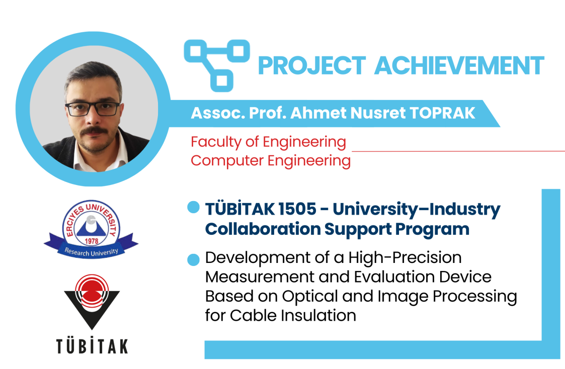 The project titled “Development of a High-Precision Measurement and Evaluation Device Based on Optical and Image Processing for Cable Insulation,” led by Assoc. Prof. Dr. Ahmet Nusret TOPRAK, from ERU Department of Computer Engineering of the Faculty of Engineering, has been awarded support under the TÜBİTAK 1505 - University-Industry Cooperation Support Program. The project team includes Assoc. Prof. Dr. Tayyip ÖZCAN and Assoc. Prof. Dr. Ömür ŞAHİN from ERU Department of Computer Engineering of the Faculty of Engineering, and Asst. Prof. Dr. Ersin KILIÇ, from the Department of Computer Engineering at Nevşehir Hacı Bektaş Veli University. The client organization for the project is Hasçelik Kablo San. ve Tic. A.Ş., and the project responsibility for the client organization is undertaken by Senior Engineer Kübra YALÇIN.