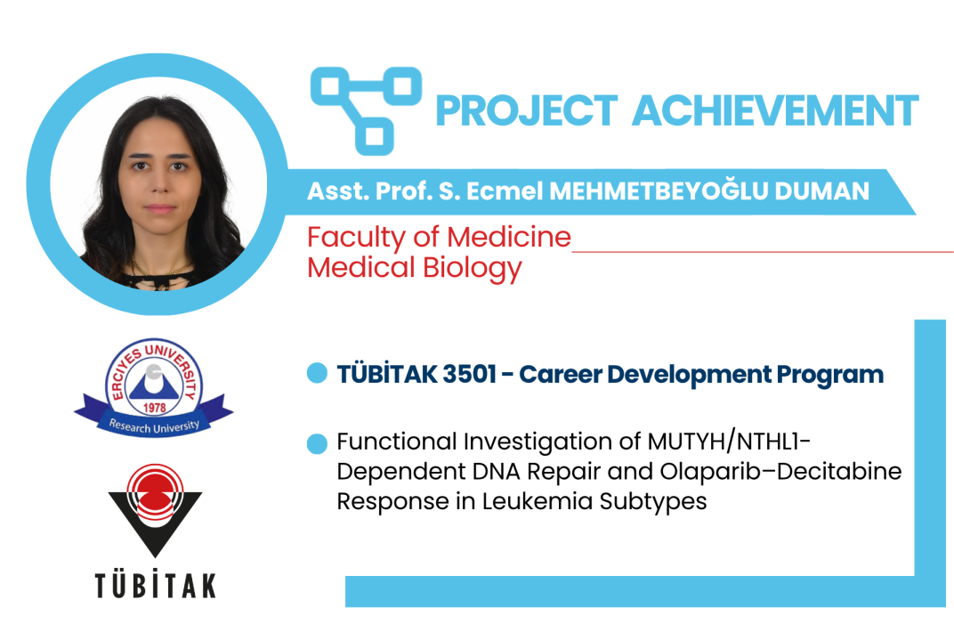 Led by Assistant Professor Sevim Ecmel MEHMETBEYOĞLU DUMAN, in the Department of Medical Biology at our university’s Faculty of Medicine; Associate Professor Dr. Neslihan MANDACI ŞANLI, a faculty member in the Department of Hematology at the Faculty of Medicine, Research Assistant Dr. Venhar ÇINAR from the Department of Medical Biology, and Dr. Fatma Zehra HAPİL ZEVKLİLER, Assistant Professor at the Faculty of Medicine, Akdeniz University, as researchers, and Prof. Dr. Serpil TAHERİ, a faculty member of the Department of Medical Biology at the Faculty of Medicine, as the advisor, The project titled “Functional Analysis of MUTYH/NTHL1-Dependent DNA Repair and the Olaparib–Decitabine Response in Leukemia Subtypes” has been awarded funding under the TÜBİTAK 3501 Career Development Program.
