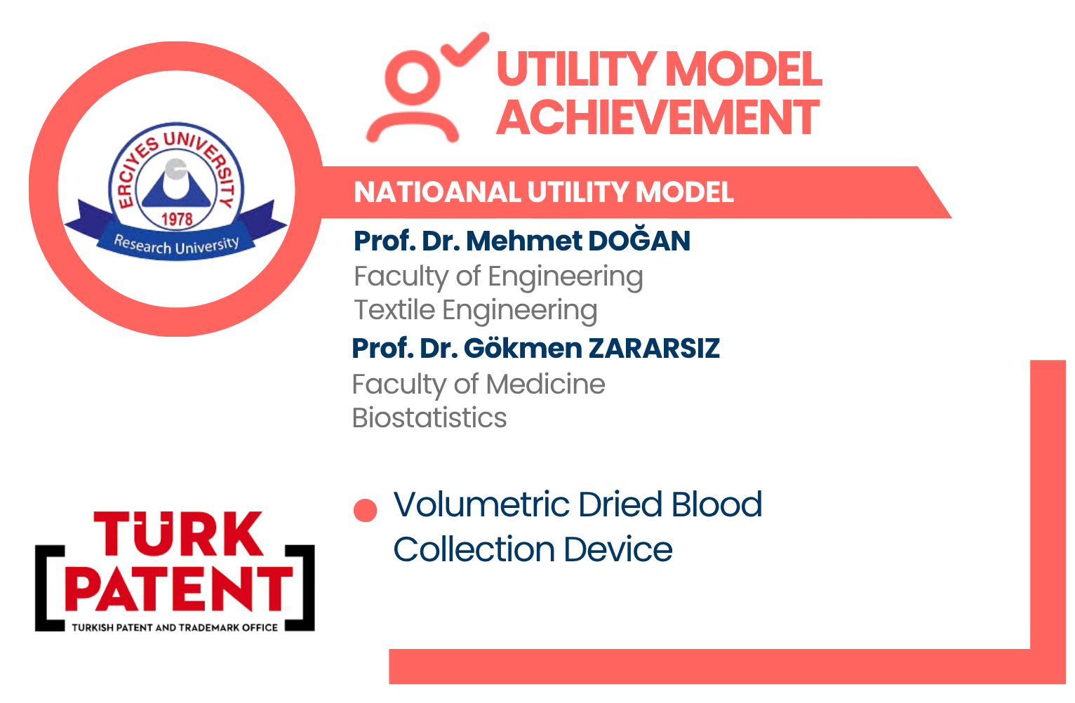 The utility model titled “Volumetric Dried Blood Collection Device,” developed by Prof. Dr. Mehmet DOĞAN, from the ERU Department of Textile Engineering of the Faculty of Engineering, and Prof. Dr. Gökmen ZARARSIZ, from the ERU Department of Biostatistics of the Faculty of Medicine, has been registered by the Turkish Patent and Trademark Office.
