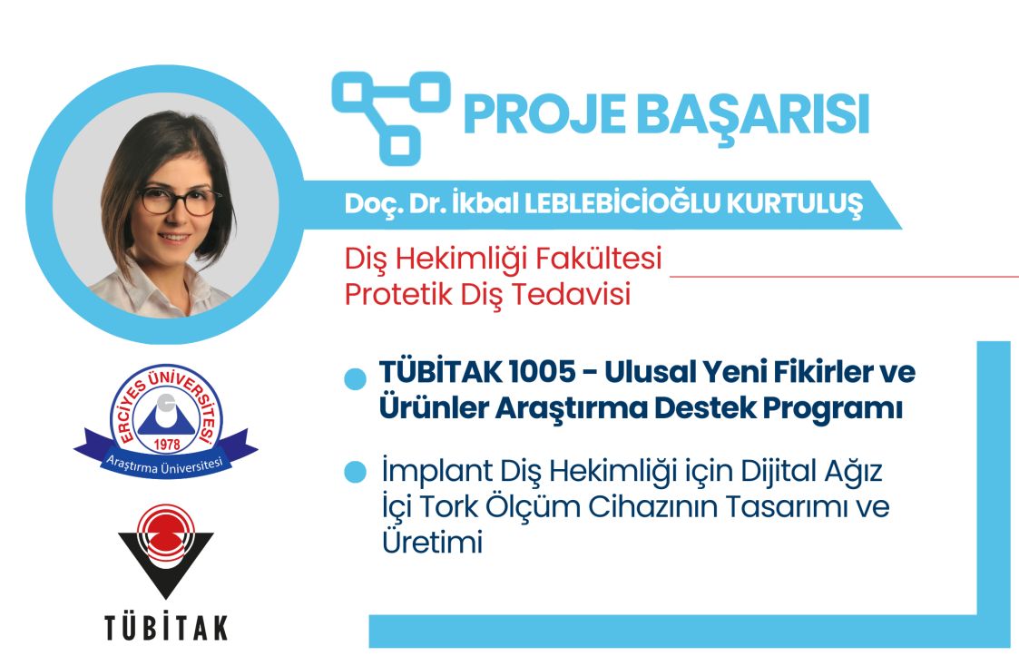 Üniversitemiz Diş Hekimliği Fakültesi Protetik Diş Tedavisi Bölümü öğretim üyesi Doç. Dr. İkbal LEBLEBİCİOĞLU KURTULUŞ'un yürütücü; aynı bölümden Prof. Dr. Kerem KILIÇ, Mühendislik Fakültesi Mekatronik Mühendisliği Bölümü'nden Arş. Gör. Dr. Burak ULU, Niğde Ömer Halisdemir Üniversitesi Diş Hekimliği Fakültesi Protetik Diş Tedavisi Bölümü'nden Dr. Öğretim Üyesi Özden Melis DURMAZ YILMAZ ve Niğde Ömer Halisdemir Üniversitesi Diş Hekimliği Fakültesi Ağız, Diş ve Çene Radyolojisi Bölümü'nden Dr. Öğretim Üyesi Serkan YILMAZ'ın araştırmacı olduğu "İmplant Diş Hekimliği için Dijital Ağız İçi Tork Ölçüm Cihazının Tasarımı ve Üretimi” başlıklı proje TÜBİTAK 1005 - ULUSAL YENİ FİKİRLER VE ÜRÜNLER ARAŞTIRMA DESTEK PROGRAMI kapsamında desteklenmeye hak kazanmıştır.