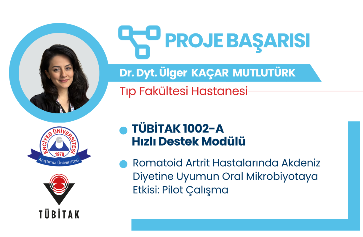Üniversitemiz Tıp Fakültesi Hastanesi personellerinden Dr. Diyetisyen Ülger KAÇAR MUTLUTÜRK'ün yürütücü, Sağlık Bilimleri Fakültesi Beslenme ve Diyetetik Bölümü öğretim üyelerinden Prof. Dr. Betül ÇİÇEK'in danışman, Tıp Fakültesi Fizik Tedavi Rehabilitasyon Bölümü öğretim üyelerinden Doç.Dr. Gizem CENGİZ ve biyoinformatik uzmanı Ahmet VARİŞ'in araştırmacı olduğu "Romatoid Artrit Hastalarında Akdeniz Diyetine Uyumun Oral Mikrobiyotaya Etkisi: Pilot Çalışma” başlıklı proje TÜBİTAK1002-A Hızlı Destek Programı kapsamında destelenmeye hak kazanmıştır.
