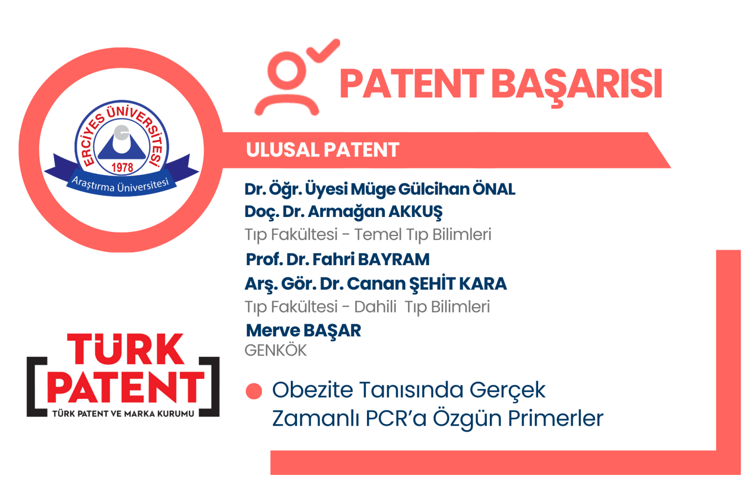 Üniversitemiz Tıp Fakültesi Temel Tıp Bilimlerinden Dr. Öğr. Üyesi Müge Gülcihan ÖNAL ve Doç. Dr. Armağan AKKUŞ, Dahili Tıp Bilimlerinden Prof. Dr. Fahri BAYRAM ve Arş. Gör. Dr. Canan ŞEHİT KARA ile GENKÖK doktora öğrencisi Merve BAŞAR tarafından geliştirilen "Obezite Tanısında Gerçek Zamanlı PCR’a Özgün Primerler" başlıklı ulusal patent Türk Patent ve Marka Kurumu tarafından tescil edilmiştir.