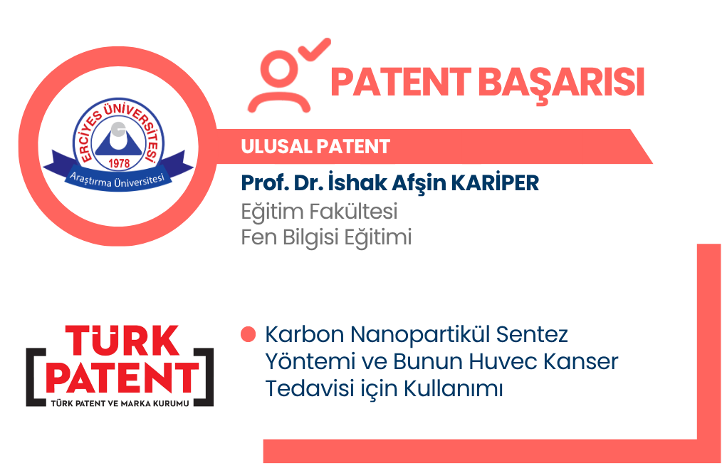 Üniversitemiz Eğitim Fakültesi Fen Bilgisi Eğitimi öğretim üyesi Prof. Dr. İshak Afşin KARİPER tarafından geliştirilen "Karbon Nanopartikül Sentez Yöntemi ve Bunun Huvec Kanser Tedavisi için Kullanımı” başlıklı ulusal patent Türk Patent ve Marka Kurumu tarafından tescil edilmiştir.