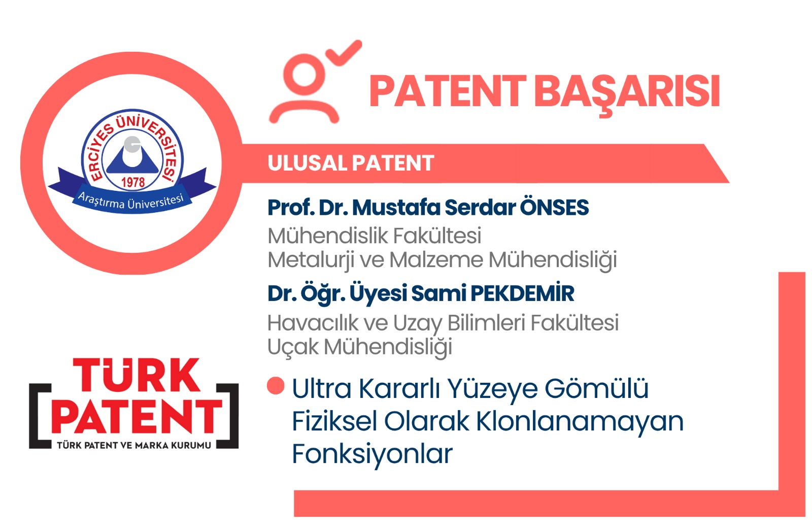 Üniversitemiz Mühendislik Fakültesi Metalurji ve Malzeme Mühendisliği Bölümü öğretim üyesi Prof. Dr. Mustafa Serdar ÖNSES, Havacılık ve Uzay Bilimleri Fakültesi Uçak Mühendisliği Bölümü Dr. Öğr. Üyesi Sami PEKDEMİR ve Üniversitemiz Metalurji ve Malzeme Mühendisliği doktora mezunlarından Dr. Abidin EŞİDİR tarafından geliştirilen "Ultra Kararlı Yüzeye Gömülü Fiziksel Olarak Klonlanamayan Fonksiyonlar" başlıklı ulusal patent Türk Patent ve Marka Kurumu tarafından tescil edilmiştir.