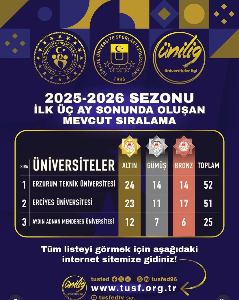 Türkiye Üniversite Sporları Federasyonu tarafından 2025-2026 Sezonu ilk üç ay sonunda oluşan