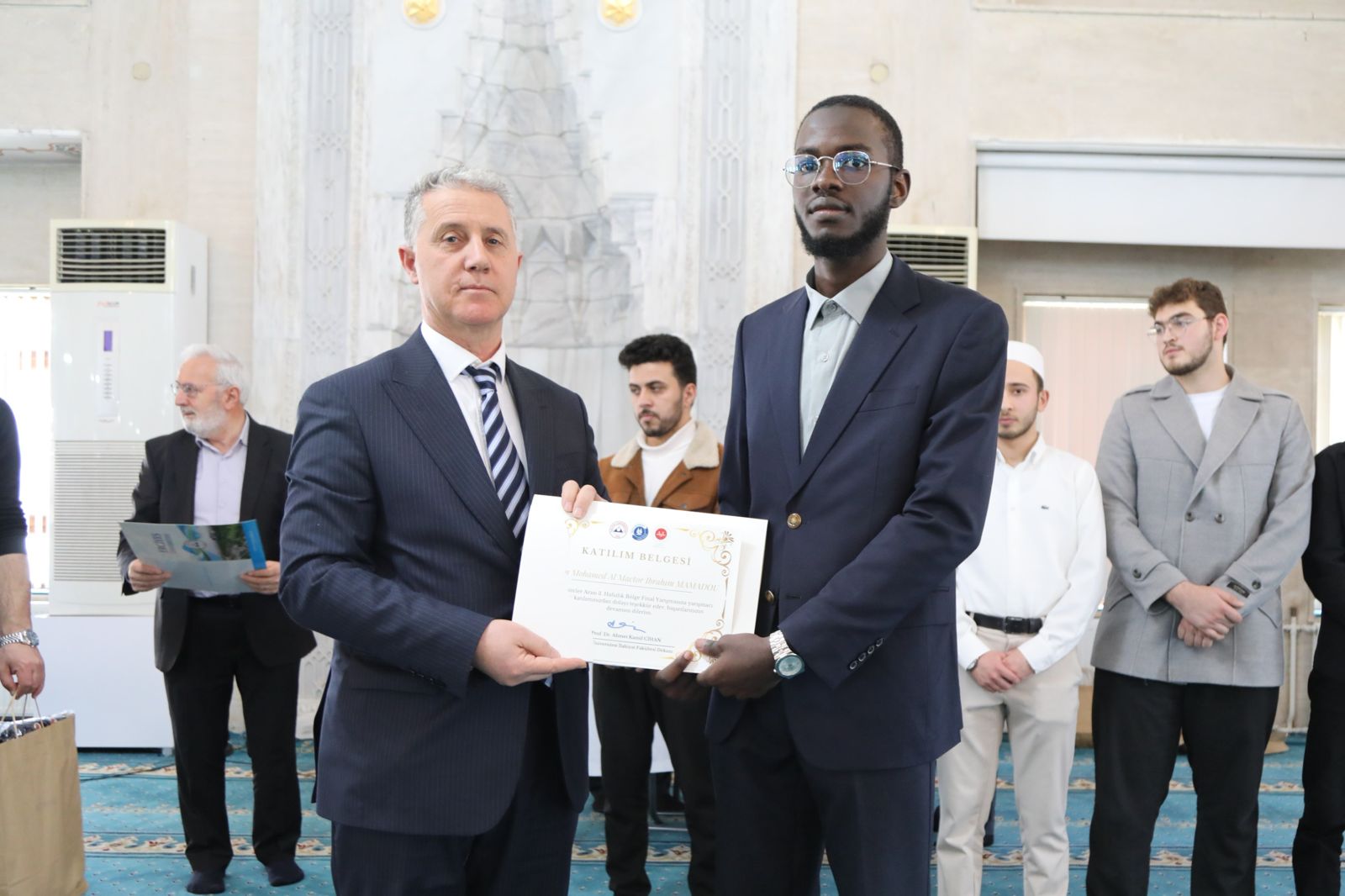 Yarışma sonunda dereceye giren öğrencilere hediyeleri İl Müftüsü Durmuş Ayvaz ve İlahiyat Fakültesi Dekanı Prof. Dr. Ahmet Kamil Cihan tarafından takdim Cihan tarafından takdim edildi.