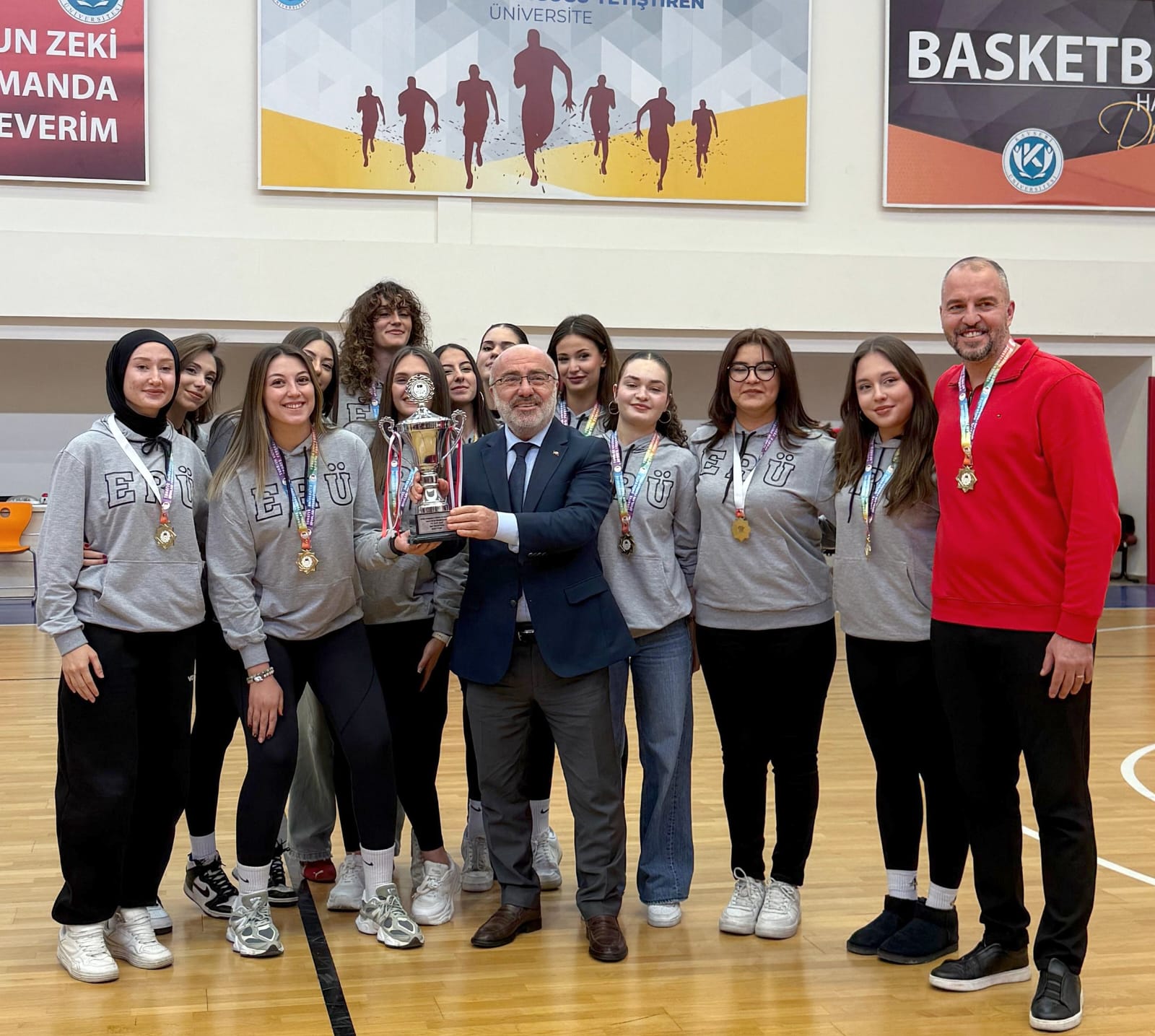 Müsabakalar sonucunda Antrenörlüğünü Spor Bilimleri Fakültesi Öğr. Gör. Hasan Aksoyak’ın yaptığı sporcularımız Sena Şahin, Nimet Nur Soyarıcı, Simay Karacabey, Yağmur Yıldız, Biricik Köyyar, Beren Aksoyak, Sude Nur Özcan, Esma Eyşan Göksu, Aslı Nur Kutlu, Feray Dalkılıç, Eda Özkan, Ela Altıntaş, Sude Özkul, Şevval Aydoğar’dan oluşan Üniversitemiz Kadın Basketbol takımı yenilgisiz şampiyon oldu.