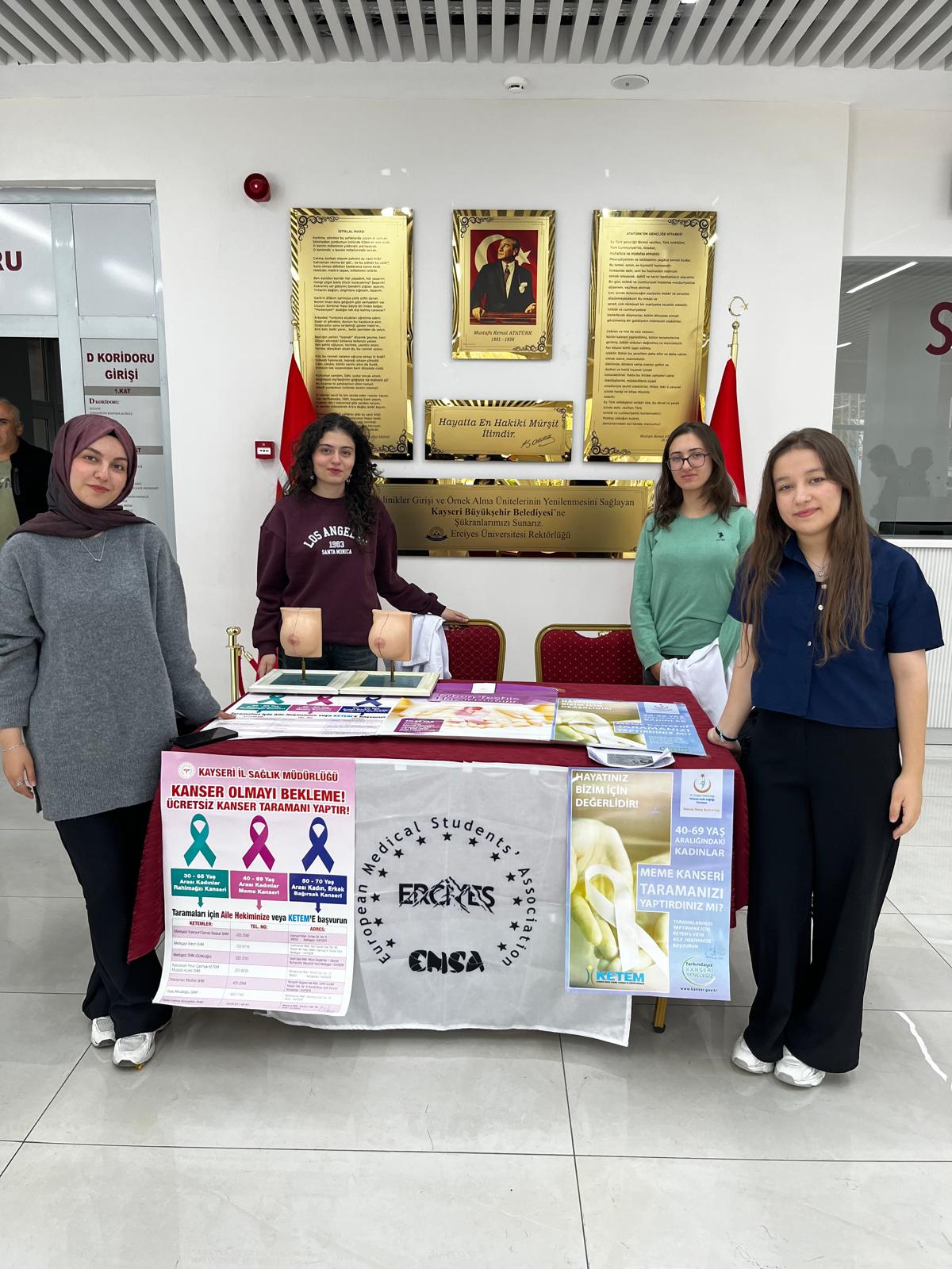 Üniversitemiz Tıp Fakültesi Gevher Nesibe Hastanesi Poliklinikler Girişinde Genel Cerrahi AD. Araştırma Görevlisi Dr. Cihan Biçer ve Üniversitemiz Tıp Fakültesi Öğrencilerinden oluşan Avrupa Tıp Öğrencileri Birliği (European Medical Students Association) Erciyes Kulübü olarak Halk Sağlığı Direktörlüğü bünyesinde meme kanseri farkındalığını artırmak amacıyla ''Meme Muayenesi Nasıl Yapılır?'' konulu stant etkinliği düzenlendi.