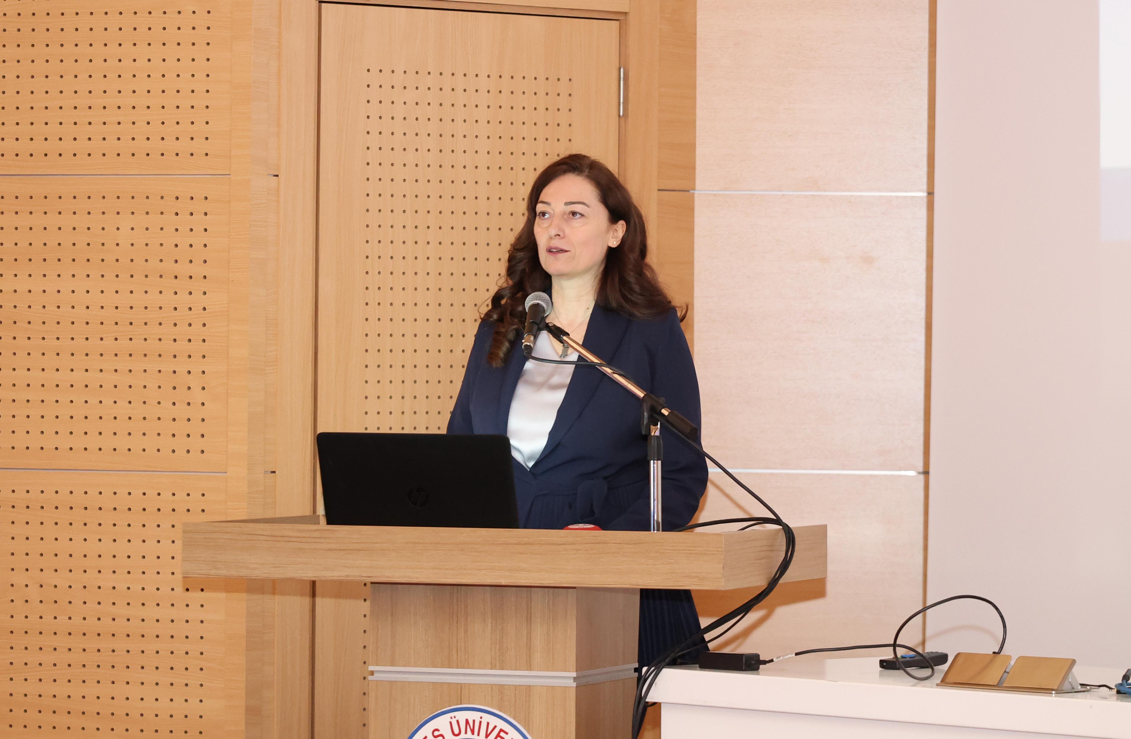 Belge takdiminin ardından toplantının konuşmacısı Strateji Geliştirme Koordinatörü Doç. Dr. Hale Kozlu, kurum iç değerlendirme raporunun kurumun öz değerlendirme çalışmalarının en önemli çıktısı olduğunu belirterek, şunları kaydetti: “Temel amacımız bizim hepimizin bildiği gibi kurumun güçlü ve gelişmeye açık yönlerinin tanınması ve iyileştirme süreçlerinin tanımlanmasını sağlamak. Bu süreçte de aslında bizim temel girdilerimizden birisi PUKÖ döngüleri. PUKÖ döngüsünün sistematik bir yaklaşımla kanıta dayalı karar alma Süreçlerinde sürekli iyileştirme, şeffaflık ve hesap verebilirlik ilkesine hizmet etme durumuyla biz aslında kurum içi değerlendirme raporlarımızı oluşturuyoruz. Bütün bu olgunluk Değerleri dediğimiz derecelendirme sistemini de PUKÖ döngüsüne göre kurgulamış oluyoruz.”