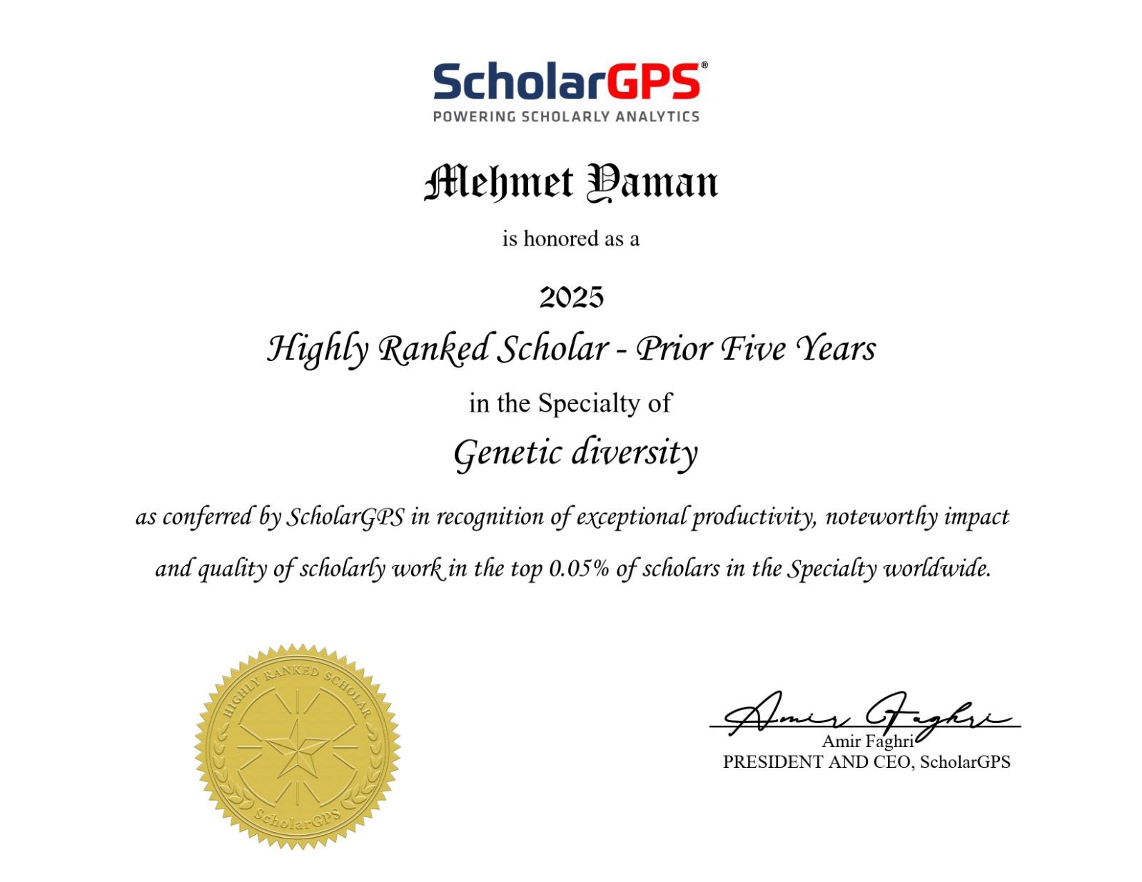 Yüksek Dereceli Akademisyenler™️, çalışmaları olağanüstü etki (atıflar) ve üstün kalite (hendeksi)gösteren, en üretken yazarlardır (yayın sayısı bakımından) Bu akademisyenler, herhangi bir alan, disiplin veya uzmanlık alanında en üst %0,05'lik dilimde yer alan bir ScholarGPS®️ sıralamasına sahiptir. Ziraat Fakültesi Öğretim Üyesi Doç. Dr. Mehmet YAMAN, ScholarGPS sıralamasında Bitki Genetiği alanında en Etkili Bilim insanları arasına girmiştir.