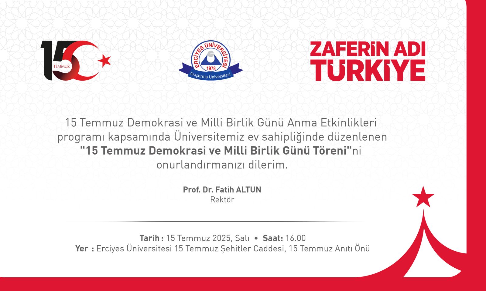 Adres : Erciyes Üniversitesi 15 Temmuz Şehitler Caddesi, 15 Temmuz Anıtı Önü