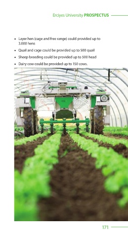 Erciyes University PROSPECTUS • Layer hen (cage and free range) could provided up to 3.000 hens • Quail and cage could be provided up to 500 quail • Sheep breeding could be provided up to 500 head • Dairy cow could be provided up to 150 cows. 171