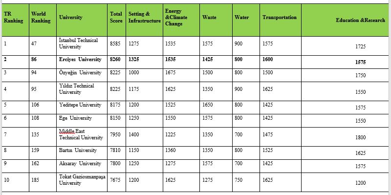 UI GreenMetric platform was established by the University of Indonesia in 2010. UI GreenMetric Ranking evaluates the current conditions and policies of the universities regarding green campus and sustainability and compares worldwide. UI GreenMetric aims to encourage paying more attention to the struggle with global climate change, energy and water conservation, waste recycling and green transportation by drawing the attention of university executives and stakeholders. ERU conducts significant studies for the purpose of providing high-level contributions to our city and country in terms of education, research and community services, and it achieves important successes in this sense. In addition, important activities are carried out to make the green campus, energy conservation and eco-friendly policies widespread by improving them in order to provide our students and staff members with clean and livable environments. Among these activities, the Solar Power Plant is planned to be installed on ERU Campus and ERU Technopark in 2023. Thus, the campus project which produces its own energy will have been carried out. Rainwater harvesting and recycling projects will continue on both campuses. The green campus and sustainability activities of our university can be accessed at https://yesilkampus.erciyes.edu.tr .