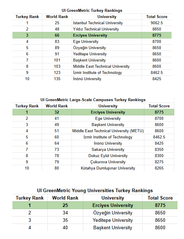 The results of the UI GreenMetric World University Rankings for 2025, which aim to draw attention to sustainability issues and increase global environmental awareness, have been announced. As a result of the evaluation based on comprehensive criteria such as environmental sensitivity, energy and climate change management, waste policies, transportation planning, and general sustainability practices, our university achieved a remarkable international success by ranking 1st in Türkiye in both the Young Universities and Large-Scale Campuses Categories, and securing the 66th position worldwide among the greenest universities.