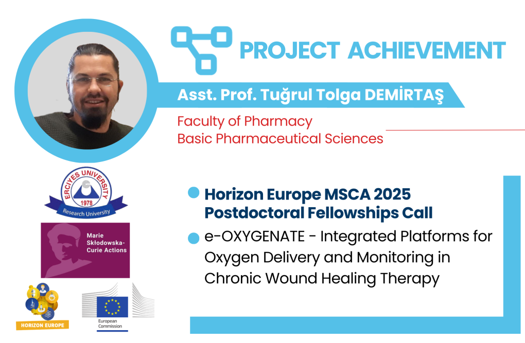 The project titled “e-OXYGENATE—Integrated Platforms for Oxygen Delivery and Monitoring in Chronic Wound Healing Therapy,” supervised by Asst. Prof. Tuğrul Tolga DEMİRTAŞ, from the ERU Department of Basic Pharmaceutical Sciences of the Faculty of Pharmacy and Erciyes University Ziya Eren Drug Research and Application Center (ERFARMA), has been awarded funding under the Horizon Europe Program Marie Sklodowska-Curie Actions Postdoctoral Fellowships Program 2025 call. Dr. Mostafa Awaid, from The Queen's University of Belfast (Northern Ireland, UK), will participate in the project as a postdoctoral researcher.