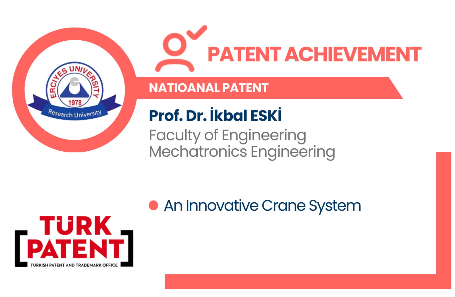 Developed by Prof. Dr. İkbal ESKİ from the ERU Faculty of Engineering and Dr. Erdi YILDIZ from Kayseri University, the national patent titled "An Innovative Crane System" has been registered by the Turkish Patent and Trademark Office.