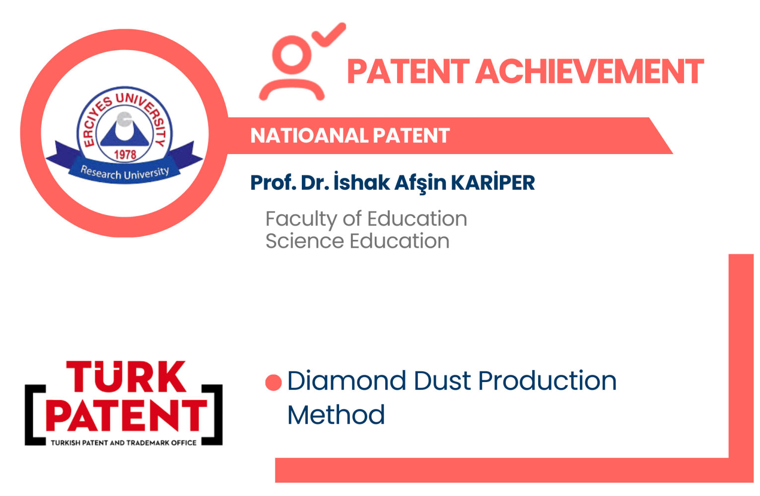 Developed by our university's Faculty of Education, Department of Science Education,faculty merber Prof. Dr. İshak Afşin KARİPER, the national patent titled " Diamond Dust Production Method" has been registered by the Turkish Patent and Trademark Office.