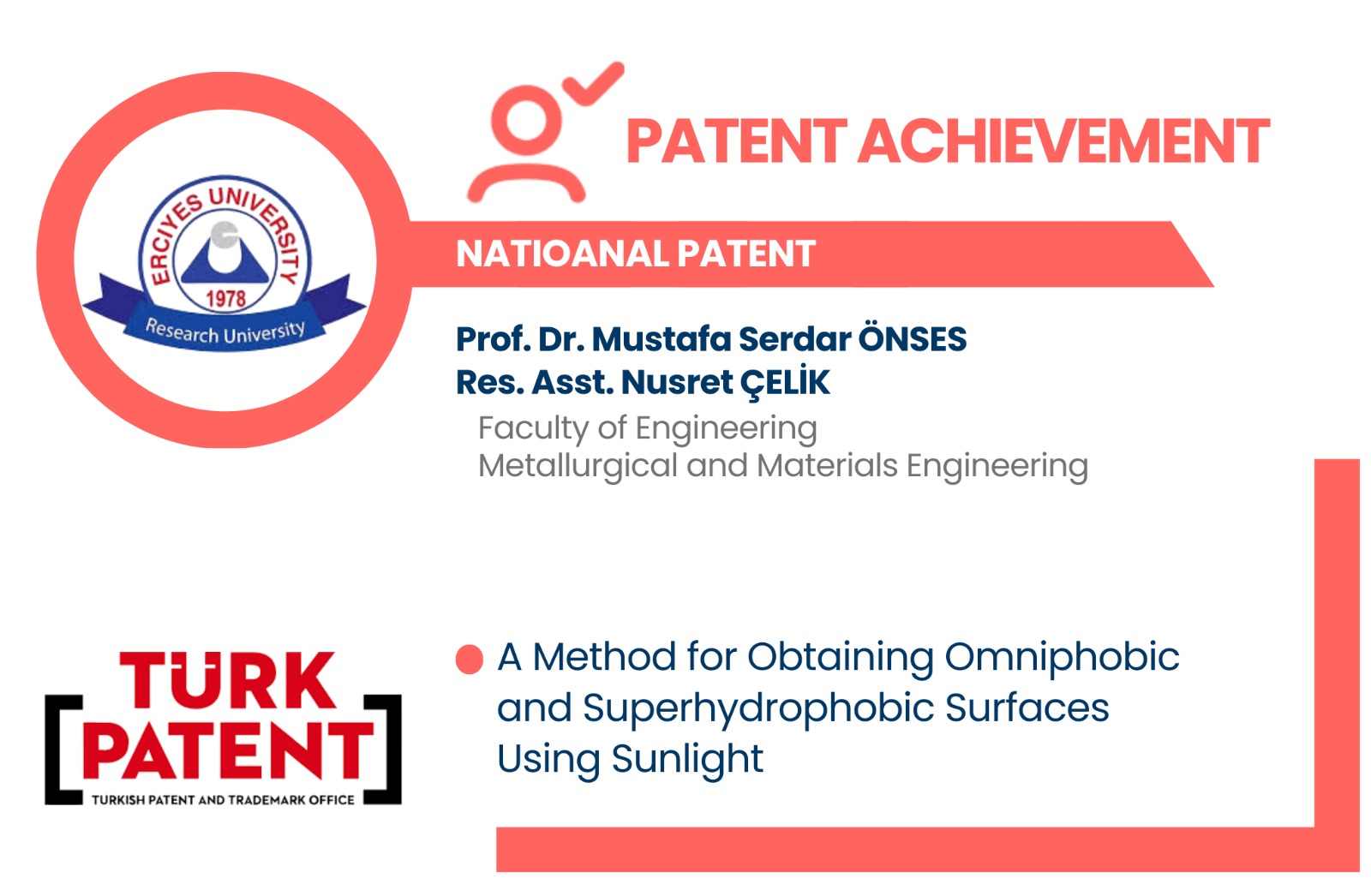 Developed by our university's Faculty of Engineering, Department of Metallurgical and Materials Engineering faculty members Prof. Dr. Mustafa Serdar ÖNSES and Res. Asst. Nusret ÇELİK, the national patent titled "A Method for Obtaining Omniphobic and Superhydrophobic Surfaces Using Sunlight" has been registered by the Turkish Patent and Trademark Office.