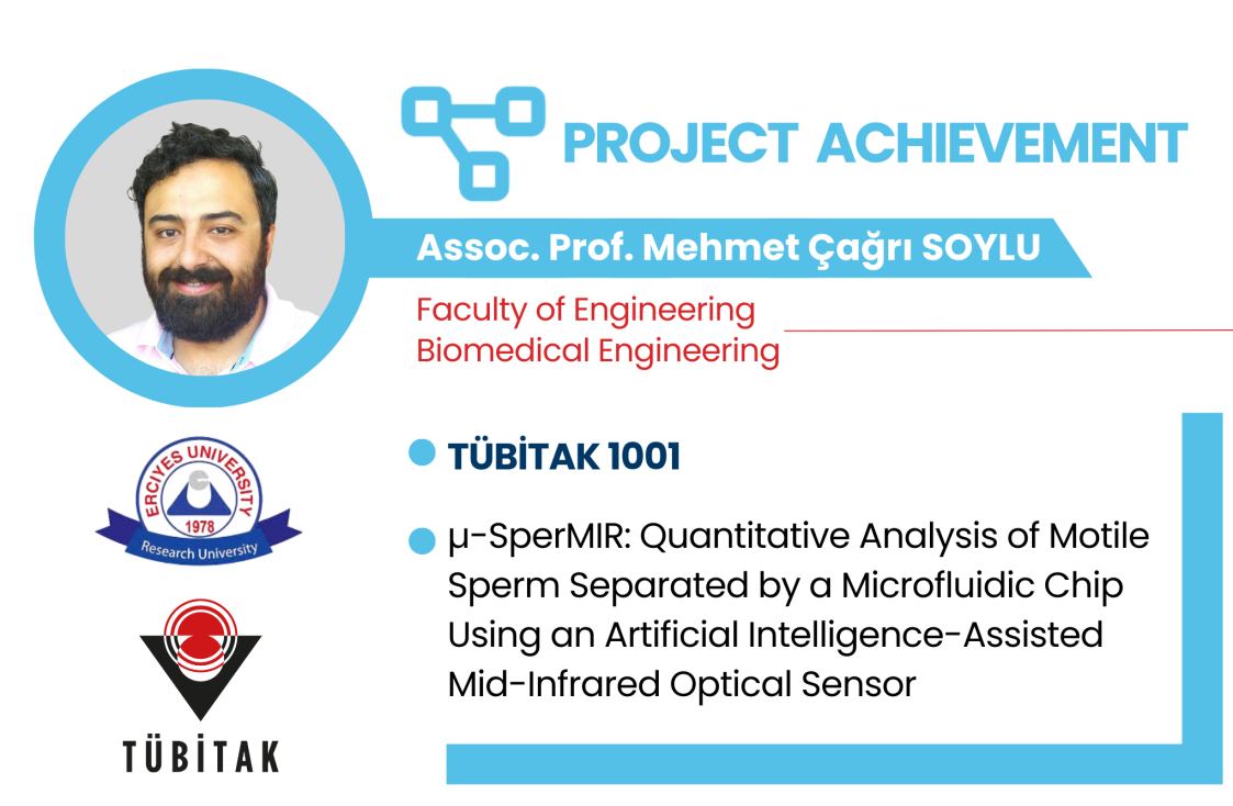 The project titled “µ-SperMIR: Quantitative Analysis of Motile Sperm Separated by a Microfluidic Chip Using an Artificial Intelligence-Assisted Mid-Infrared Optical Sensor,” led by Assoc. Prof. Mehmet Çağrı SOYLU, from the ERU Department of Biomedical Engineering of the Faculty of Engineering, has been awarded funding by TÜBİTAK under the TUBİTAK 1001- Scientific and Technological Research Projects Funding Programme. Project team includes Assoc. Prof. Emine Yegân ERDEM, from İhsan Doğramacı Bilkent University, as advisor, and Assoc. Prof. Emre Can AKINSAL, from the ERU Department of Urology of the Faculty of Medicine, as researcher.