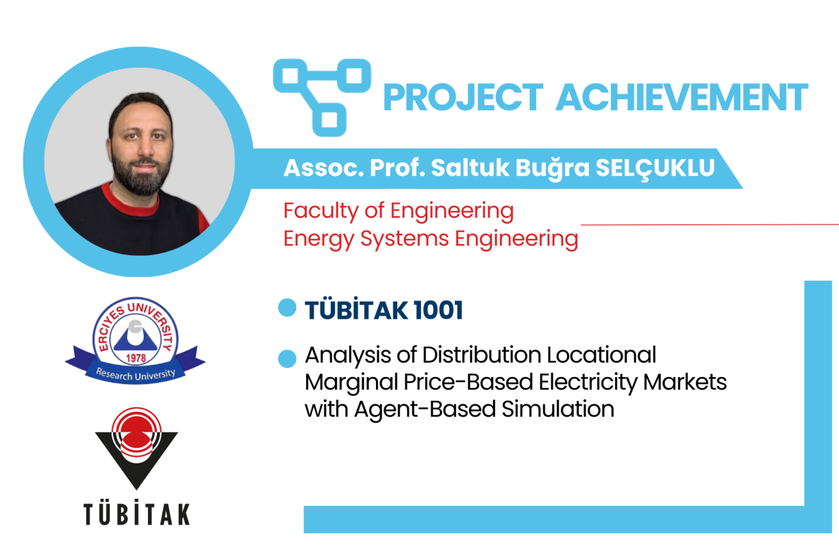 The project titled “Analysis of Distribution Locational Marginal Price-Based Electricity Markets with Agent-Based Simulation,” led by Assoc. Prof. Saltuk Buğra SELÇUKLU from the ERU Department of Energy Systems Engineering of the Faculty of Engineering, has been awarded funding by TÜBİTAK under the TUBİTAK 1001- Scientific and Technological Research Projects Funding Programme. The project team includes Prof. Dr. Celal Öztürk, from the ERU Department of Software Engineering of the Faculty of Engineering, as advisor; Assist. Prof. Erhan Muğaloğlu, Res. Asst. Seda Nur Bozkurt, and Res. Asst. Erdemhan Özdin from the Eciyes University, Assoc. Prof. Sibel Arslan from Sivas Cumhuriyet University, and Assist. Prof. Göktürk Poyrazoğlu from Özyeğin University, as researchers.