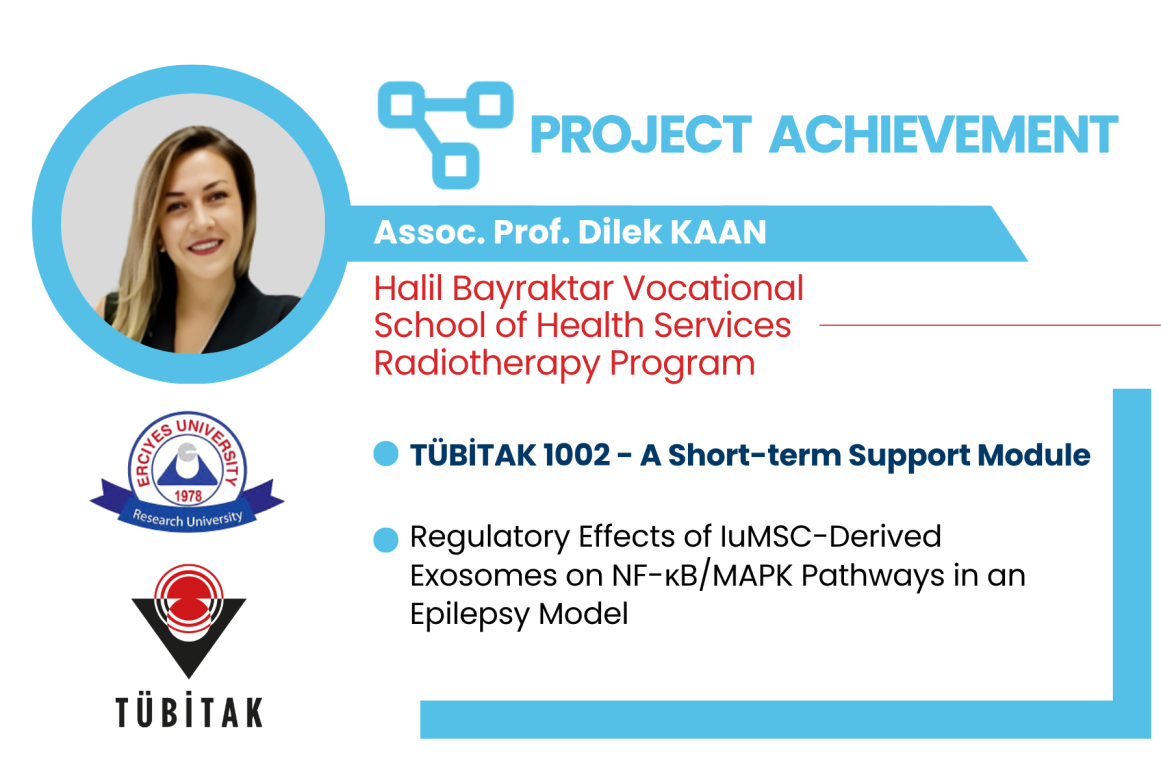 The project titled "Regulatory Effects of iuMSC-Derived Exosomes on NF-κB/MAPK Pathways in an Epilepsy Model" led by Assoc. Prof. Dilek KAAN from the ERU Radiotherapy Program at Halil Bayraktar Vocational School of Health Services, has been awarded funding by TÜBİTAK under the TÜBİTAK 1002 - A Short-term Support Module. Project team includes Prof. Dr. Füsun Ferda ERDOĞAN, from the ERU Department of Neurology of the Faculty of Medicine, as an advisor.