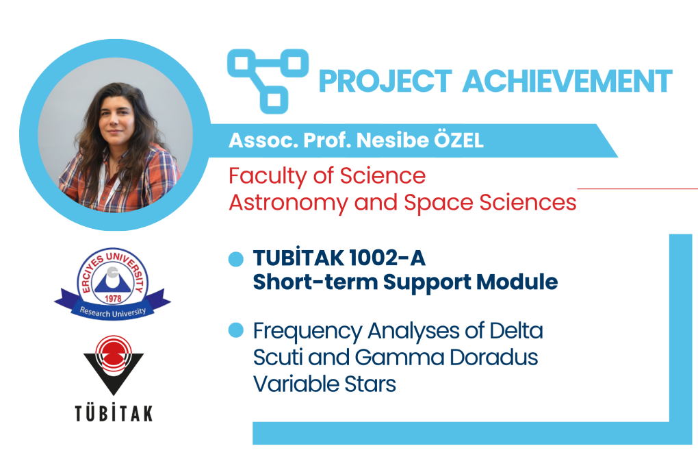 The project titled “Frequency Analyses of Delta Scuti and Gamma Doradus Variable Stars”, led by Assoc. Prof. Nesibe ÖZEL from the ERU Department of Astronomy and Space Sciences of the Faculty of Sciences, has been awarded funding by TÜBİTAK under the TUBİTAK 1002-A Short-term Support Module.