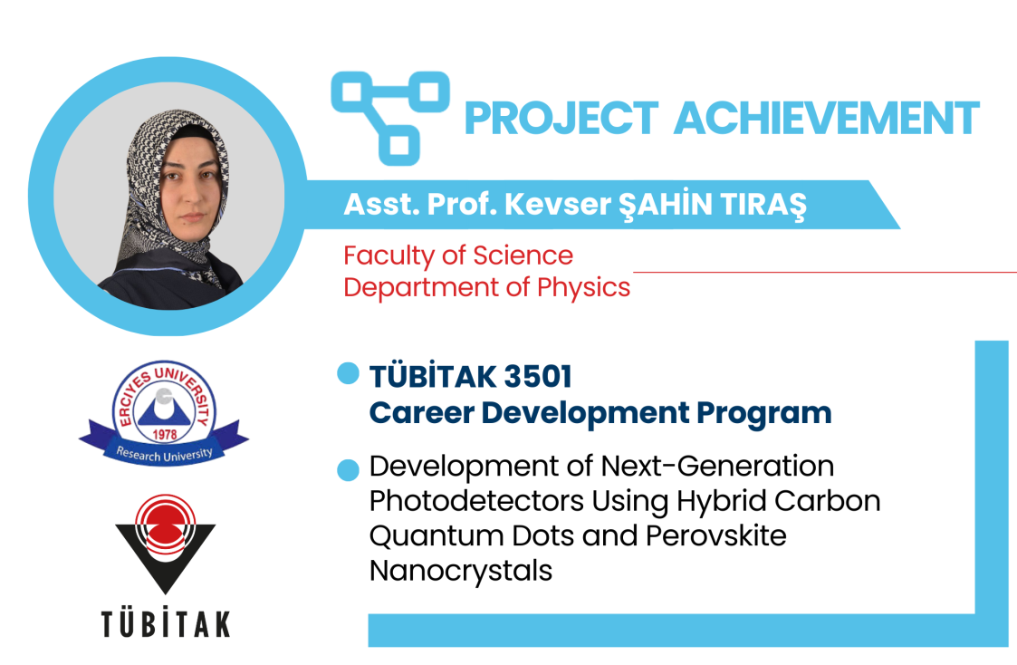 The project titled “Development of Next-Generation Photodetectors Using Hybrid Carbon Quantum Dots and Perovskite Nanocrystals,” led by Asst. Prof. Kevser ŞAHİN TIRAŞ from the ERU Department of Physics of the Faculty of Science, has been awarded funding by TÜBİTAK under the TÜBİTAK 3501 Career Development Program. The project team includes Asst. Prof. Talha ERDEM, from the Abdullah Gül University and Dr. Sema KARABEL ÖCAL, from the Nanome Nanotechnology R&D Consulting Industry and Trade Ltd. Co., as researcher.