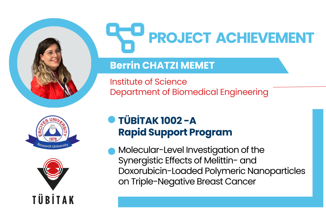 The project titled “Molecular-Level Investigation of the Synergistic Effects of Melittin- and Doxorubicin-Loaded Polymeric Nanoparticles on Triple-Negative Breast Cancer,” led by Berrin CHATZI MEMET from the ERU Department of Biomedical Engineering of the Institute of Science, has been awarded funding by TÜBİTAK under the TUBİTAK 1002-A Short-term Support Module. The project team includes Assoc. Prof. Ömer AYDIN from ERU Department of Biomedical Engineering as a advisor and Prof. Dr. Zuhal HAMURCU from Genome and Stem Cell Center as a researcher.