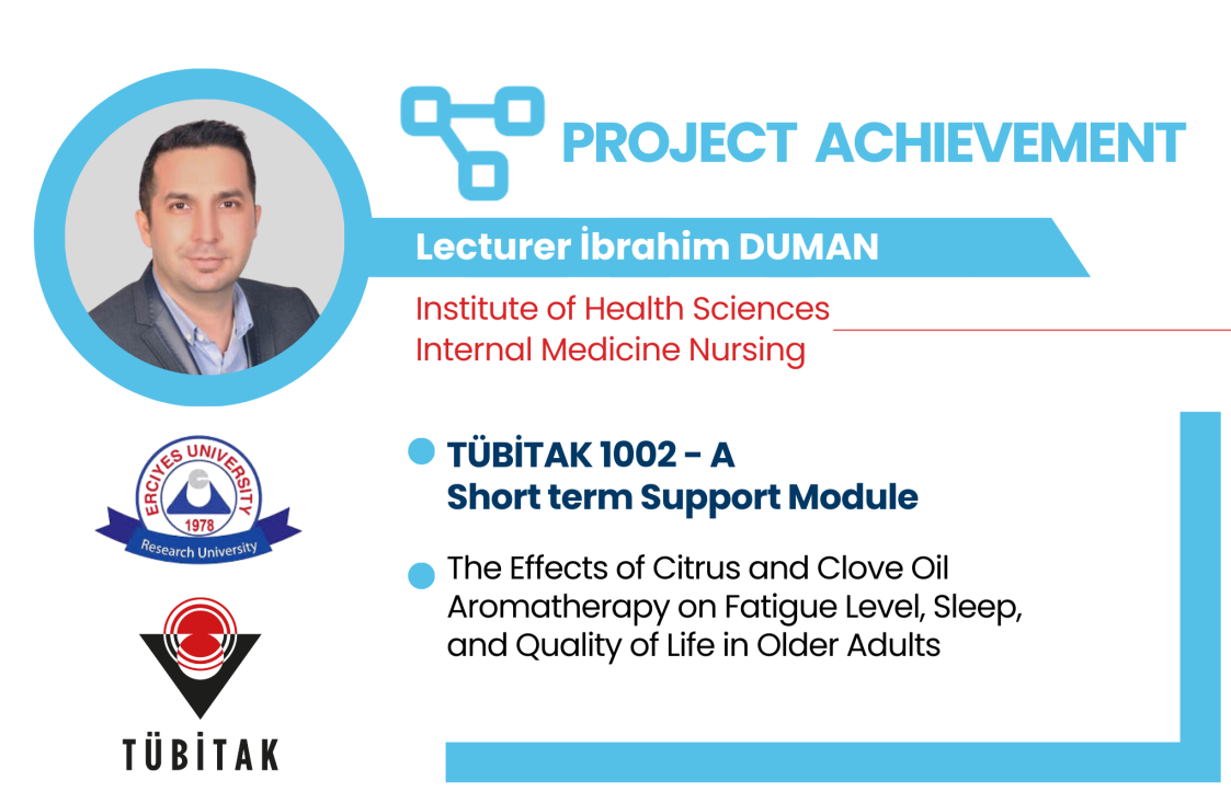 The project titled “The Effects of Citrus and Clove Oil Aromatherapy on Fatigue Level, Sleep, and Quality of Life in Older Adults,” led by Lecturer İbrahim Duman from the ERU Department of Internal Medicine Nursing of the Institute of Health Sciences, has been awarded funding by TÜBİTAK under the TUBİTAK 1002-A Short-term Support Module. The project team includes Prof. Dr. Sultan Taşcı, from the ERU Department of Internal Medicine Nursing of the Faculty of Health Sciences, as advisor and Prof. Dr. İsmail Ün, from the Mersin University Department of Medical Pharmacology of the Faculty of Medicine, as researcher.