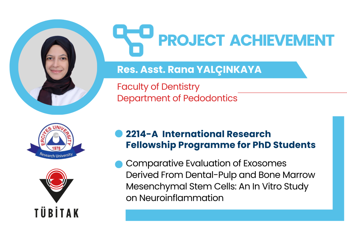 Within the scope of the TÜBİTAK-2214 International Research Fellowship Programme for PhD Students, the project titled “Comparative Evaluation of Exosomes Derived From Dental-Pulp and Bone Marrow Mesenchymal Stem Cells: An In Vitro Study on Neuroinflammation” led by Res. Asst. Rana YALÇINKAYA, from the ERU Department of Paediatrics of the Faculty of Dentistry, has been awarded funding. The project will be carried out at the Queen’s University Belfast (United Kingdom) under the domestic supervision of Assoc. Prof. Esra Kızılcı, and international supervision of Prof. Dr. Ikhlas El Karim.