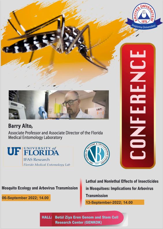 In the context of the outgoing project: “Enhancing arbovirus surveillance and risk management in the public health systems of Georgia, Turkey, and Ukraine” (code FRBAA14620523) between The Veterinary Faculty of Erciyes University and the Vector and Vector-borne Diseases Application and Research Center in collaboration with the Institute of Food and Agricultural Sciences, Florida Medical Entomology Laboratory from the University of Florida and within the support of DEFENSE THREAT REDUCTION AGENCY in United States of America, there will be organized two conferences under the title “Mosquito Ecology and Arbovirus Transmission” and “Lethal and Nonlethal Effects of Insecticides in Mosquitoes: Implications for Arbovirus Transmission” presented by Assistant Professor Barry Wilmer ALTO (P.I. University of Florida)