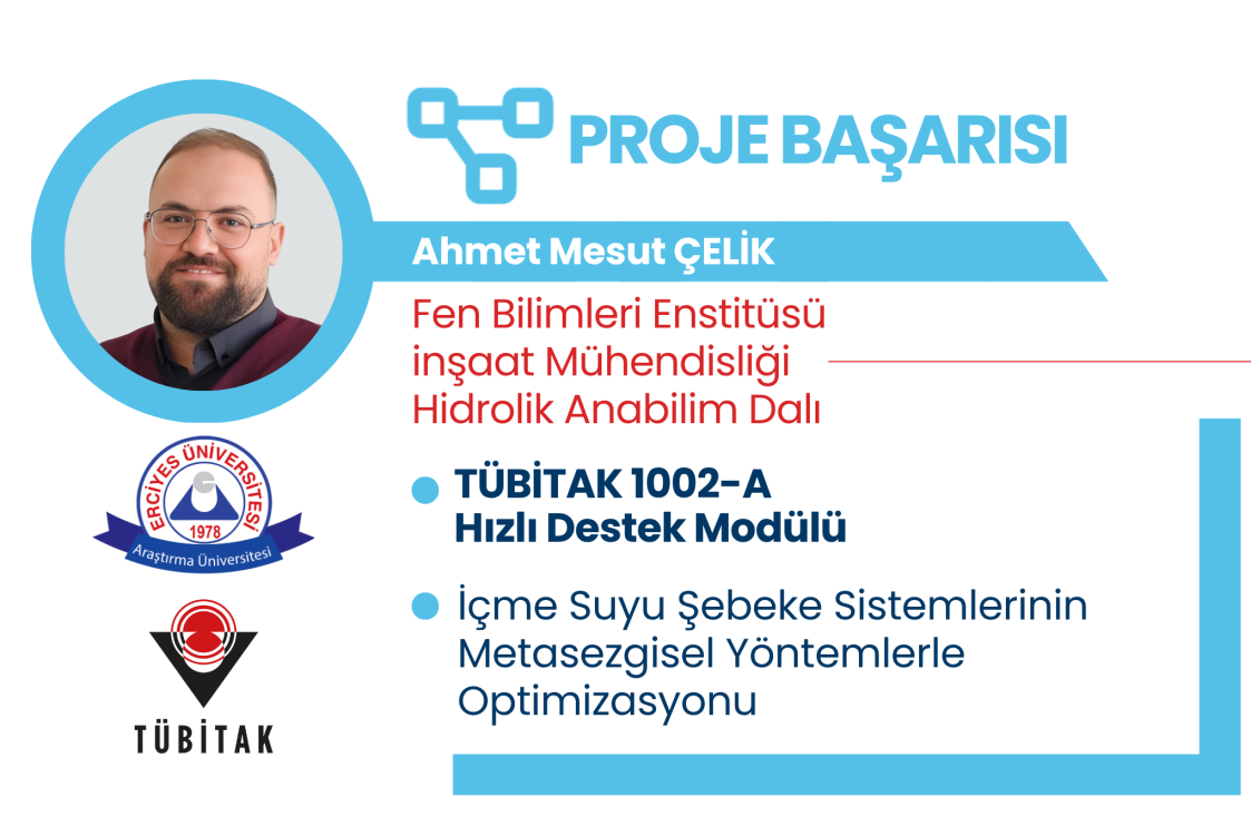 Üniversitemiz Fen Bilimleri Enstitüsü İnşaat Mühendisliği Hidrolik Anabilim Dalı doktora öğrencisi Ahmet Mesut ÇELİK'in yürütücü ve Mühendislik Fakültesi İnşaat Mühendisliği Bölümü öğretim üyesi Prof. Dr. Ahmet Alper ÖNER'in danışman olduğu "İçme Suyu Şebeke Sistemlerinin Metasezgisel Yöntemlerle Optimizasyonu” başlıklı proje TÜBİTAK 1002-A Hızlı Destek Modülü kapsamında desteklenmeye hak kazanmıştır.