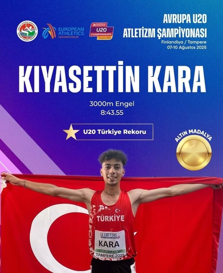 Avrupa Atletizm Birliği (EA) tarafından, 07 – 10 Ağustos 2025 tarihleri arasında Finlandiya Tampere şehrinde düzenlenen Avrupa U20 Atletizm Şampiyonasında, Üniversitemiz Spor Bilimleri Fakültesi Antrenörlük Bölümü öğrencisi Kıyasettin KARA, 3.000 m Engel finalinde 8:43.55 derece ile U20 Türkiye Rekoru da kırarak, Avrupa Şampiyonu olmuştur.