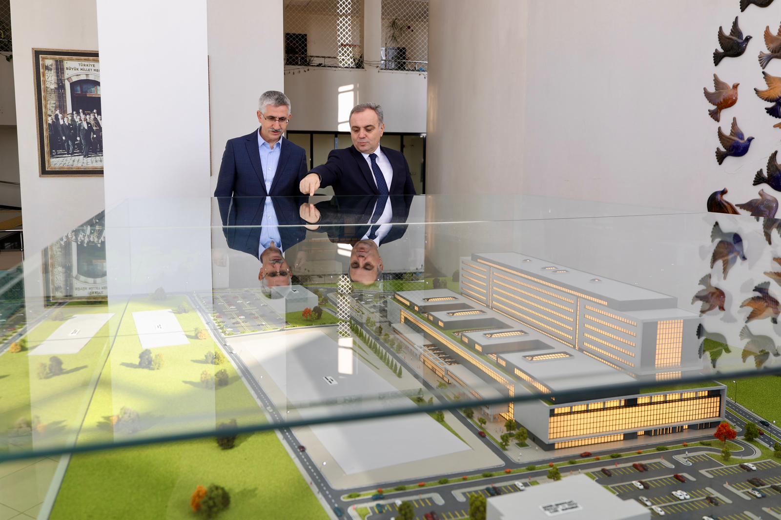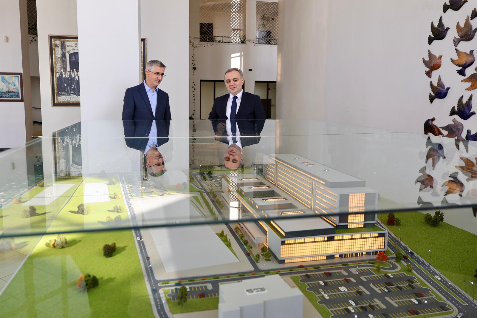 Ziyaretin sonunda Rektörümüz Prof. Dr. Fatih Altun, Bakan Yardımcısı Nazif Yılmaz’a yeni hastane binamızın maketi üzerinden proje hakkında bilgi verdi.