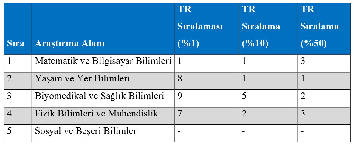Leiden Sıralaması kapsamında 400 farklı araştırma alanında yapılan bilimsel yayınlar da değerlendirilmiş ve üniversiteler 5 ana araştırma alanı başlığı altında sıralanmıştır. Araştırma alanlarında yüksek atıf alma oranlarına dayalı olarak yapılan değerlendirmede ise ERÜ’nün Türkiye üniversiteleri içerisindeki sıralamaları aşağıdaki tabloda verilmiştir.