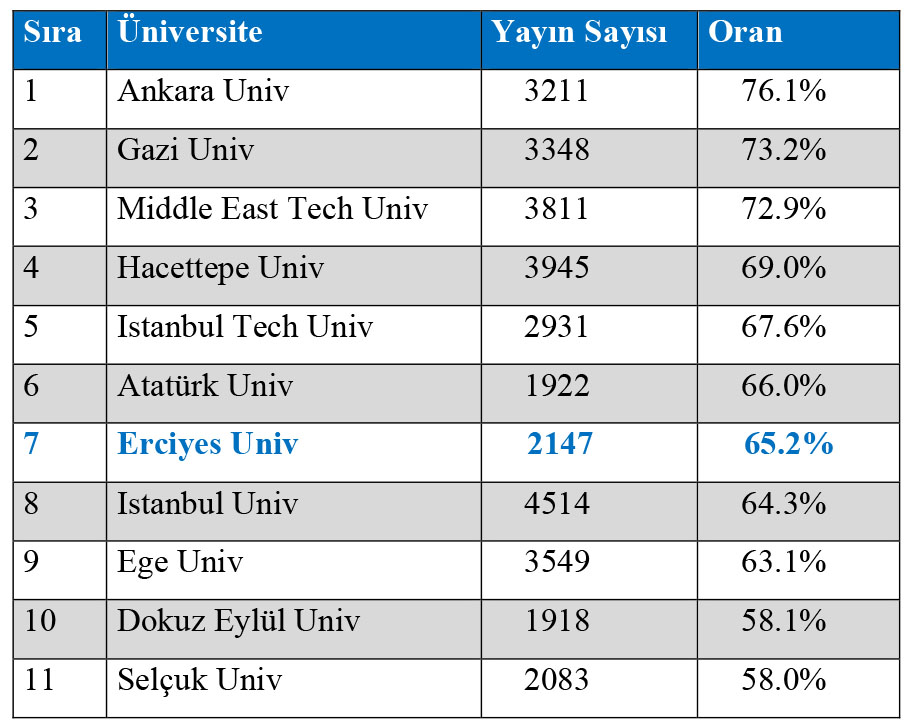 fazla yayın üreten üniversitelerin dahil edildiği değerlendirmelerde 3 görünüş