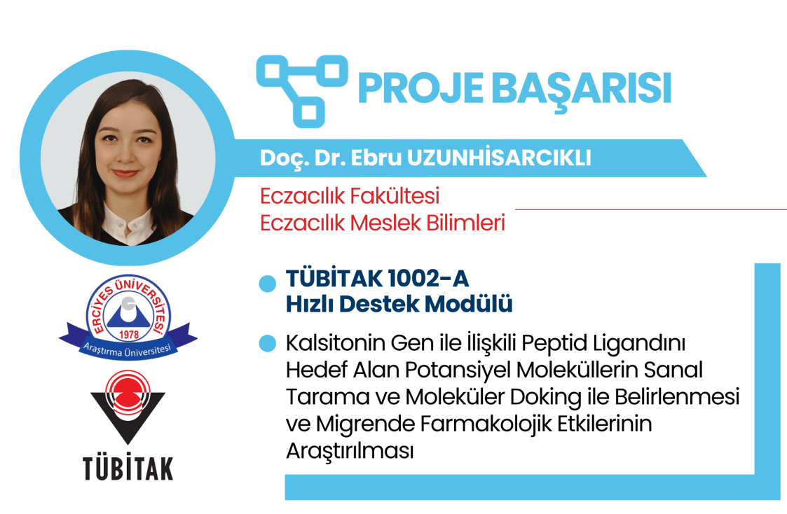 Üniversitemiz Eczacılık Fakültesi Eczacılık Meslek Bilimleri Bölümü öğretim üyesi Doç. Dr. Ebru UZUNHİSARCIKLI'nın yürütücü, Doç. Dr. İsmail ÇELİK ve Arş. Gör. Burak KIRILMAZ'ın araştırmacı olduğu “Kalsitonin Gen ile İlişkili Peptid Ligandını Hedef Alan Potansiyel Moleküllerin Sanal Tarama ve Moleküler Doking ile Belirlenmesi ve Migrende Farmakolojik Etkilerinin Araştırılması” başlıklı proje, TÜBİTAK 1002-A Hızlı Destek Programı kapsamında desteklenmeye hak kazanmıştır.
