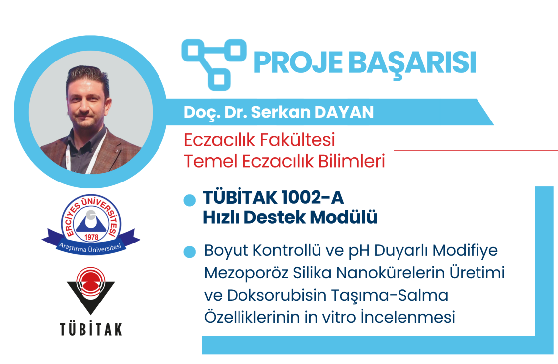 Üniversitemiz Eczacılık Fakültesi Temel Eczacılık Bilimleri Bölümü öğretim üyesi Doç. Dr. Serkan DAYAN'ın yürütücü, Mühendislik Fakültesi Biyomedikal Mühendisliği Bölümü öğretim üyesi Doç. Dr. Ömer AYDIN ve İlaç Uygulama ve Araştırma Merkezi'nden (ERFARMA) Öğr. Gör. Gizem KURŞUNLUOĞLU'nun araştırmacı, Sağlık Bilimleri Enstitüsü İlaç Araştırma, Geliştirme ve Uygulama anabilimdalı yüksek lisans öğrencisi Ecz. Fatmanur UYAN’ın bursiyer olduğu "Boyut Kontrollü ve pH Duyarlı Modifiye Mezoporöz Silika Nanokürelerin Üretimi ve Doksorubisin Taşıma-Salma Özelliklerinin in vitro İncelenmesi” başlıklı proje TÜBİTAK1002-A Hızlı Destek Programı kapsamında desteklenmeye hak kazanmıştır.