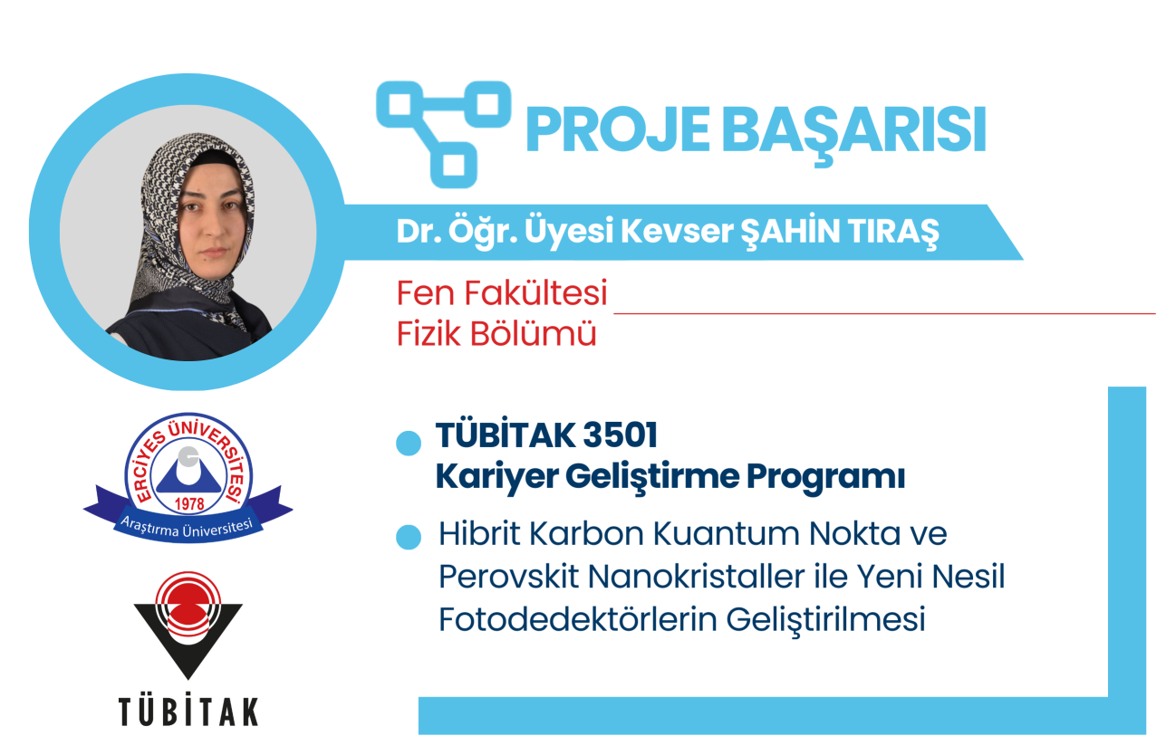 Üniversitemiz Fen Fakültesi Fizik Bölümü öğretim üyesi Dr. Öğr. Üyesi Kevser ŞAHİN TIRAŞ'ın yürütücü; Abdullah Gül Üniversitesinden Dr. Öğr. Üyesi Talha ERDEM ve Nanome Nanoteknoloji Arge Danışmanlık Sanayi ve Ticaret Ltd. Şti.'den Dr. Sema KARABEL ÖCAL'ın araştırmacı olduğu "Hibrit Karbon Kuantum Nokta ve Perovskit Nanokristaller ile Yeni Nesil Fotodedektörlerin Geliştirilmesi” başlıklı proje TÜBİTAK 3501 Kariyer Geliştirme Programı kapsamında desteklenmeye hak kazanmıştır.