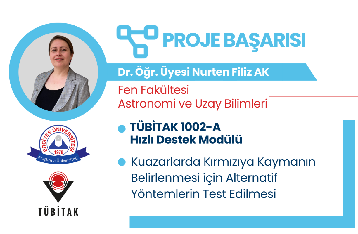 Üniversitemiz Fen Fakültesi Astronomi ve Uzay Bilimleri Bölümünden Dr. Öğr. Üyesi Nurten Filiz AK'ın yürütücü olduğu "Kuazarlarda Kırmızıya Kaymanın Belirlenmesi için Alternatif Yöntemlerin Test Edilmesi” başlıklı proje TÜBİTAK1002-A Hızlı Destek Programı kapsamında desteklenmeye hak kazanmıştır.