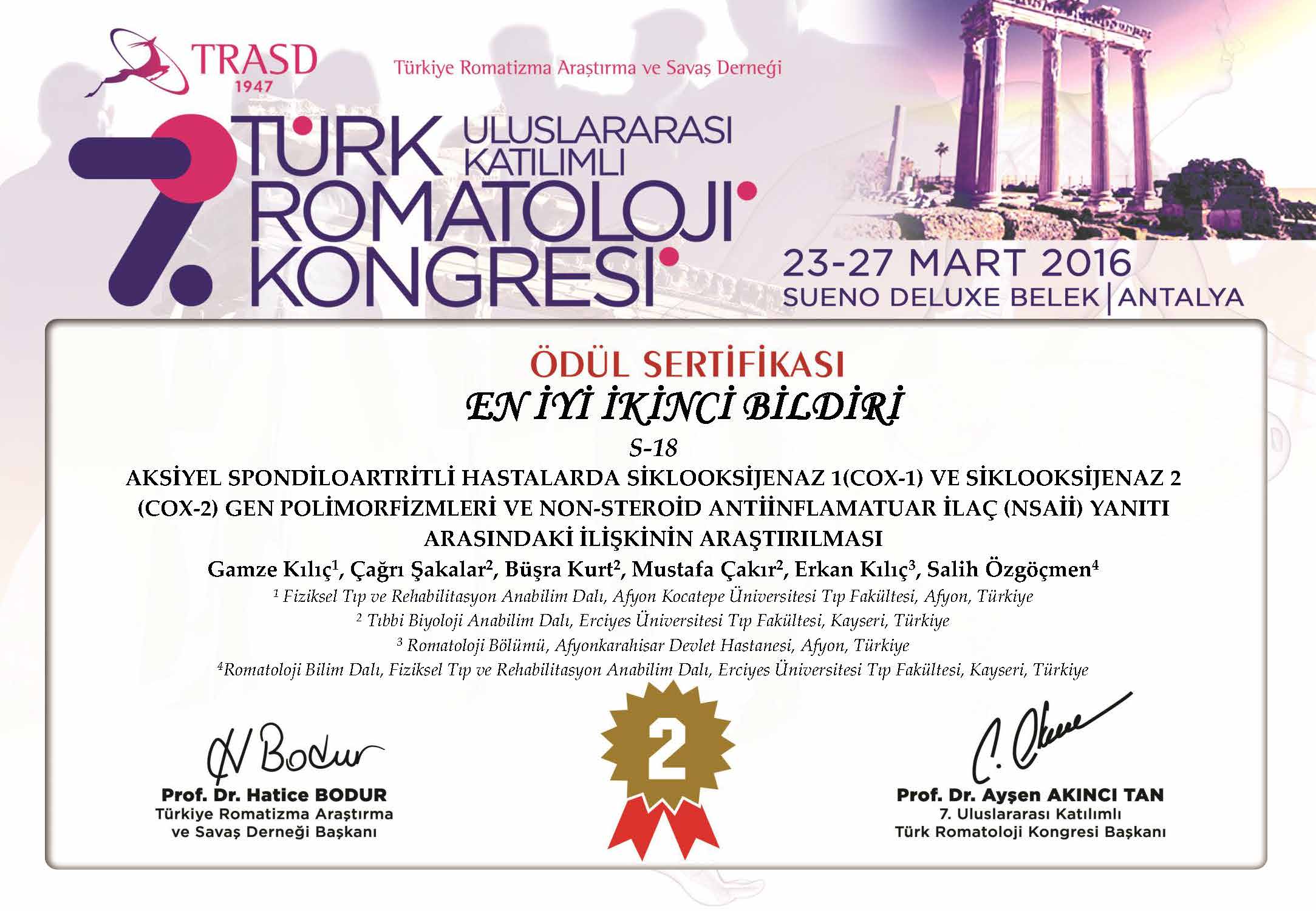Tıp Fakültemiz Fiziksel Tıp ve Rehabilitasyon Ana Bilim Dalı Romatoloji Bilim Dalı ve Tıbbi Biyoloji Anabilim Dalı tarafından ortaklaşa yürütülmüş olan, “AKSİYEL SPONDİLOARTRİTLİ HASTALARDA SİKLOOKSİJENAZ 1(COX-1) VE SİKLOOKSİJENAZ 2 (COX-2) GEN POLİMORFİZMLERİ VE NON-STEROİD ANTİİNFLAMATUAR İLAÇ (NSAİİ) YANITI ARASINDAKİ İLİŞKİNİN ARAŞTIRILMASI” başlıklı araştırma, 23-27 Mart 2016 tarihlerinde Türkiye Romatizma Araştırma ve Savaş Derneği (TRASD) tarafından Antalya’da düzenlenen 7. Uluslararası Katılımlı Türk Romatoloji Kongresi’nde “