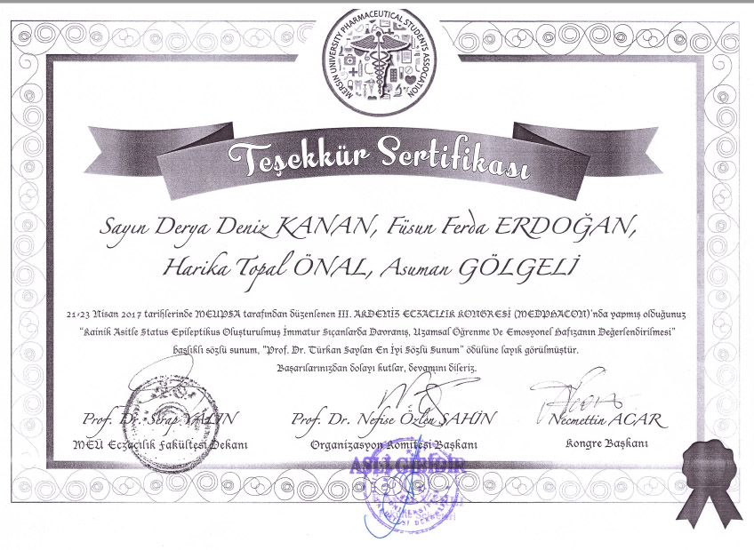 Tıp Fakültesi Fizyoloji Anabilim Dalı Öğretim Üyesi Prof. Dr. Asuman Gölgeli, Nöroloji Anabilim Dalı Öğretim üyesi Prof. Dr. Füsun Ferda Erdoğan, 21-23 Nisan 2017 tarihleri arasında düzenlenen III. Akdeniz Eczacılık Kongresi’nde sunulan “Rainik Asitle Status Epileptikus Oluşturulmuş İmmatur Sıçanlarda Davranış, Uzamsal Öğrenme ve Emosyonel Hafızanın Değerlendirilmesi” başlıklı sözlü sunumları ile Prof. Dr. Türkan Saylan En İyi Sözlü Sunum Ödülü'ne layık görülmüştür.
