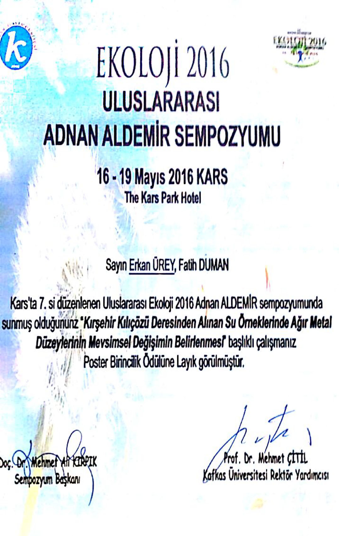 16-19 Mayıs 2016 tarihleri arasında Kars’ta 7. si düzenlenenUluslararası Ekoloji 2016 Adnan ALDEMİR Sempozyumunda, Fen Fakültesi Biyoloji Bölümü Öğretim Üyesi Doç. Dr. Fatih DUMAN“Kırşehir Kılıçözü Deresinden Alınan Su Örneklerinde Ağır Metal Düzeylerinin Mevsimsel Değişimin Belirlenmesi” konu başlıklı sunumuyla en iyi poster sunum ödülünü almıştır.
