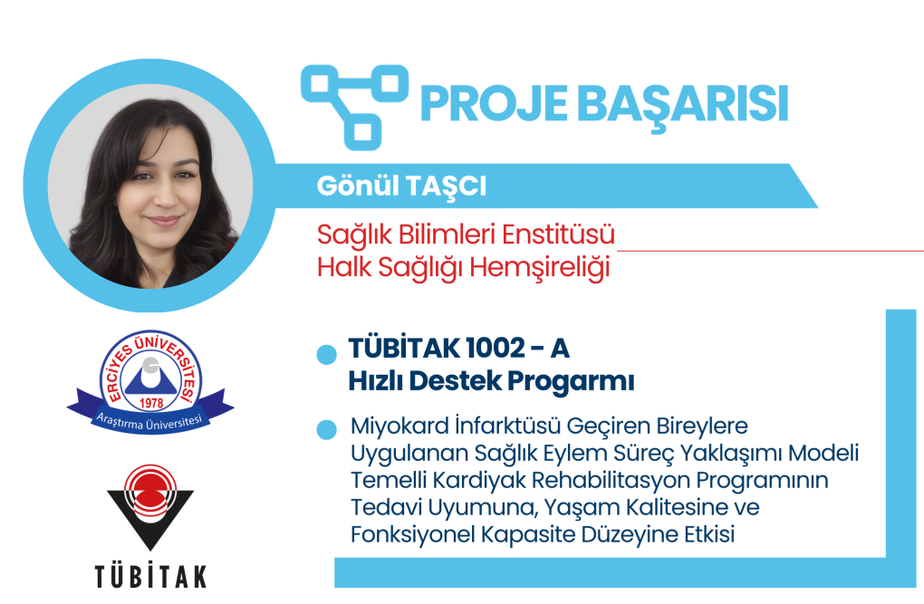 Üniversitemiz Sağlık Bilimleri Enstitüsü Halk Sağlığı Hemşireliği Anabilim Dalı doktora öğrencisi Gönül TAŞCI'nın yürütücü; Sağlık Bilimleri Fakültesi Hemşirelik Bölümü öğretim üyesi Prof. Dr. Handan ZİNCİR'in danışman ve Kayseri Şehir Hastanesinden Doç. Dr. Gökhan ERGÜN'ün araştırmacı olduğu "Miyokard İnfarktüsü Geçiren Bireylere Uygulanan Sağlık Eylem Süreç Yaklaşımı Modeli Temelli Kardiyak Rehabilitasyon Programının Tedavi Uyumuna, Yaşam Kalitesine ve Fonksiyonel Kapasite Düzeyine Etkisi” başlıklı proje TÜBİTAK 1002-A Hızlı Destek Modülü kapsamında desteklenmeye hak kazanmıştır.